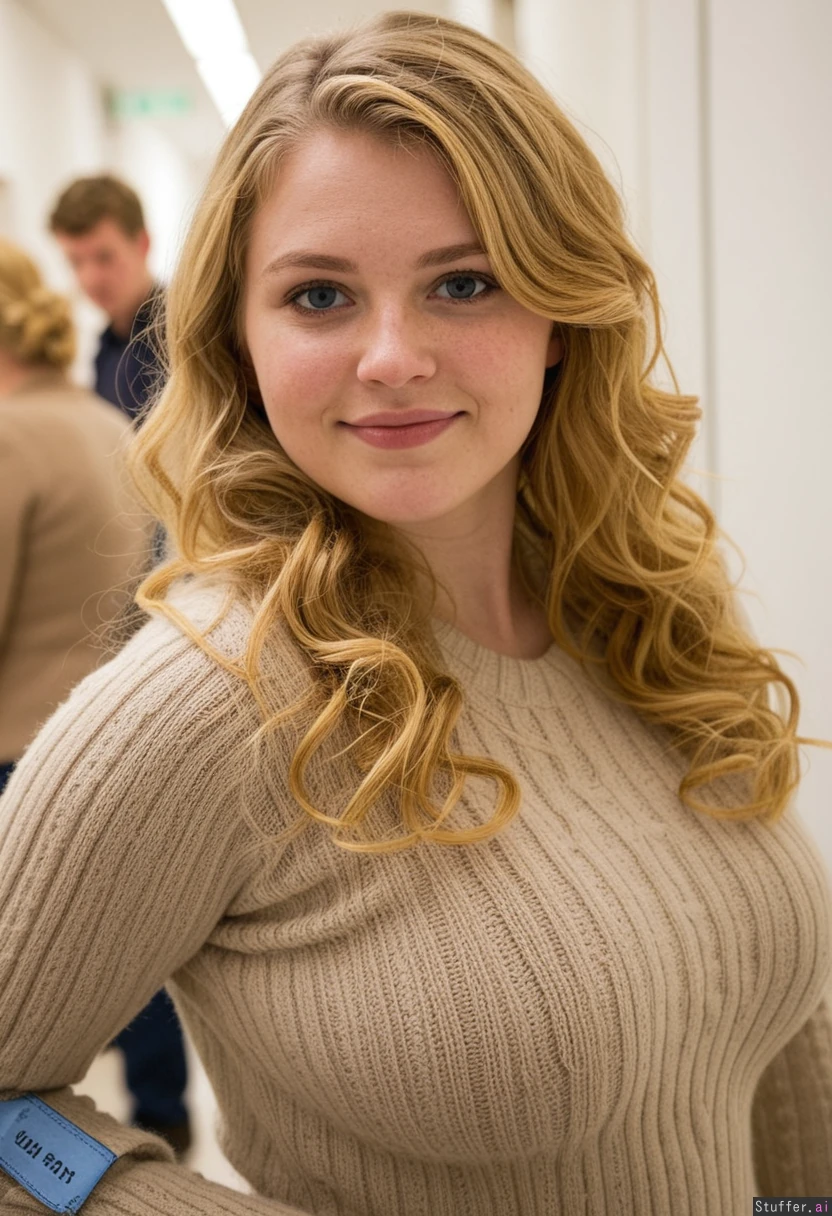 19-year-old Dutch girl, round face, blue eyes, small-upturned-nose,, pretty-eyes, wavy-blonde-hair, shy-smile, no-makup, natural-look, pretty, cute-features in a hallway, co-worker wearing a beige cable sweater, (jeans) plump, full-figured bokeh, blurry-background, portrait 4k-masterpiece, best-quality, good-lighting, dslr-quality, highly-detailed, ultra-detail, weight_gain