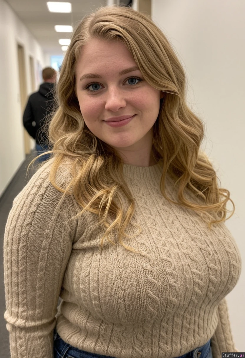 19-year-old Dutch girl, round face, blue eyes, small-upturned-nose,, pretty-eyes, wavy-blonde-hair, shy-smile, no-makup, natural-look, pretty, cute-features in a hallway, co-worker wearing a beige cable sweater, (jeans) plump, full-figured bokeh, blurry-background, portrait 4k-masterpiece, best-quality, good-lighting, dslr-quality, highly-detailed, ultra-detail, weight_gain weight_gain weight_gain