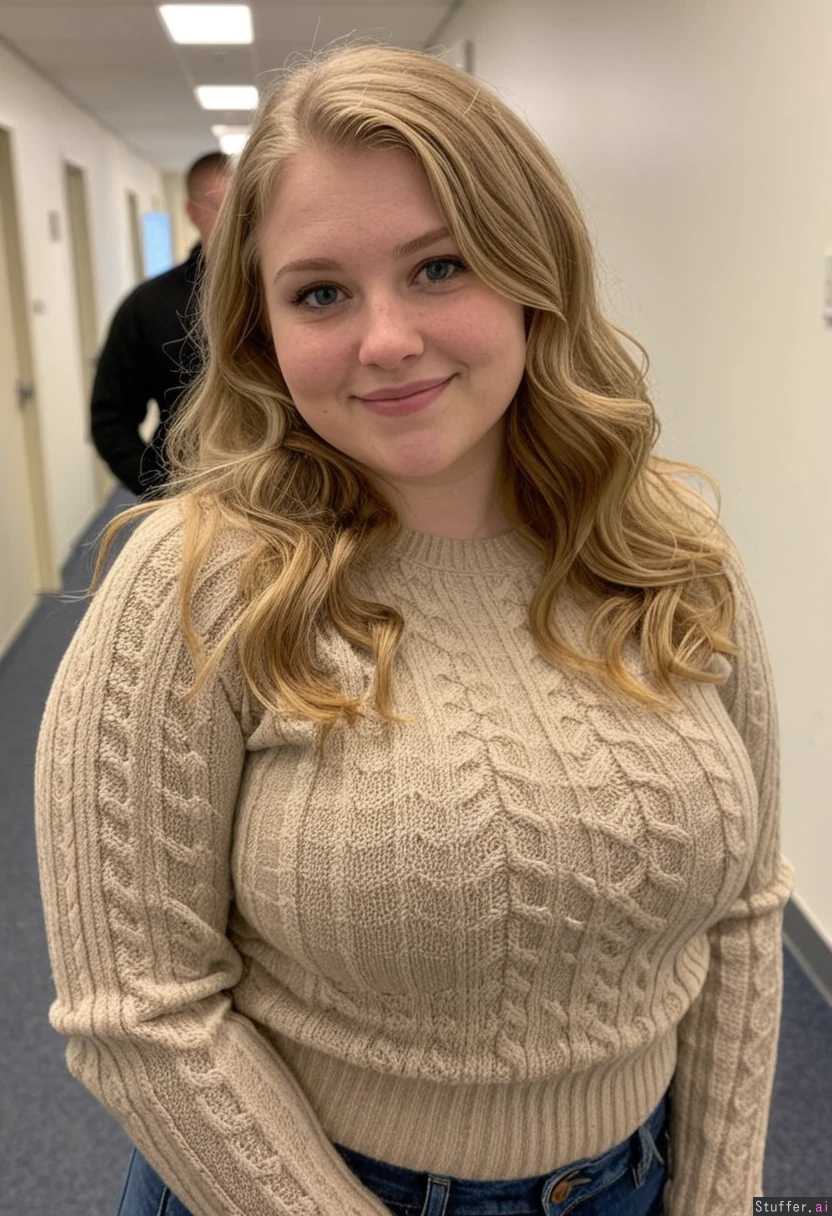 19-year-old Dutch girl, round face, blue eyes, small-upturned-nose,, pretty-eyes, wavy-blonde-hair, shy-smile, no-makup, natural-look, pretty, cute-features in a hallway, co-worker wearing a beige cable sweater, (jeans) plump, full-figured bokeh, blurry-background, portrait 4k-masterpiece, best-quality, good-lighting, dslr-quality, highly-detailed, ultra-detail, weight_gain weight_gain weight_gain aged_up grow_fat