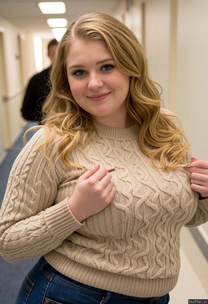 19-year-old Dutch girl, round face, blue eyes, small-upturned-nose,, pretty-eyes, wavy-blonde-hair, shy-smile, no-makup, natural-look, pretty, cute-features in a hallway, co-worker wearing a beige cable sweater, (jeans) plump, full-figured bokeh, blurry-background, portrait 4k-masterpiece, best-quality, good-lighting, dslr-quality, highly-detailed, ultra-detail, weight_gain weight_gain massive_weight_gain grow_obese