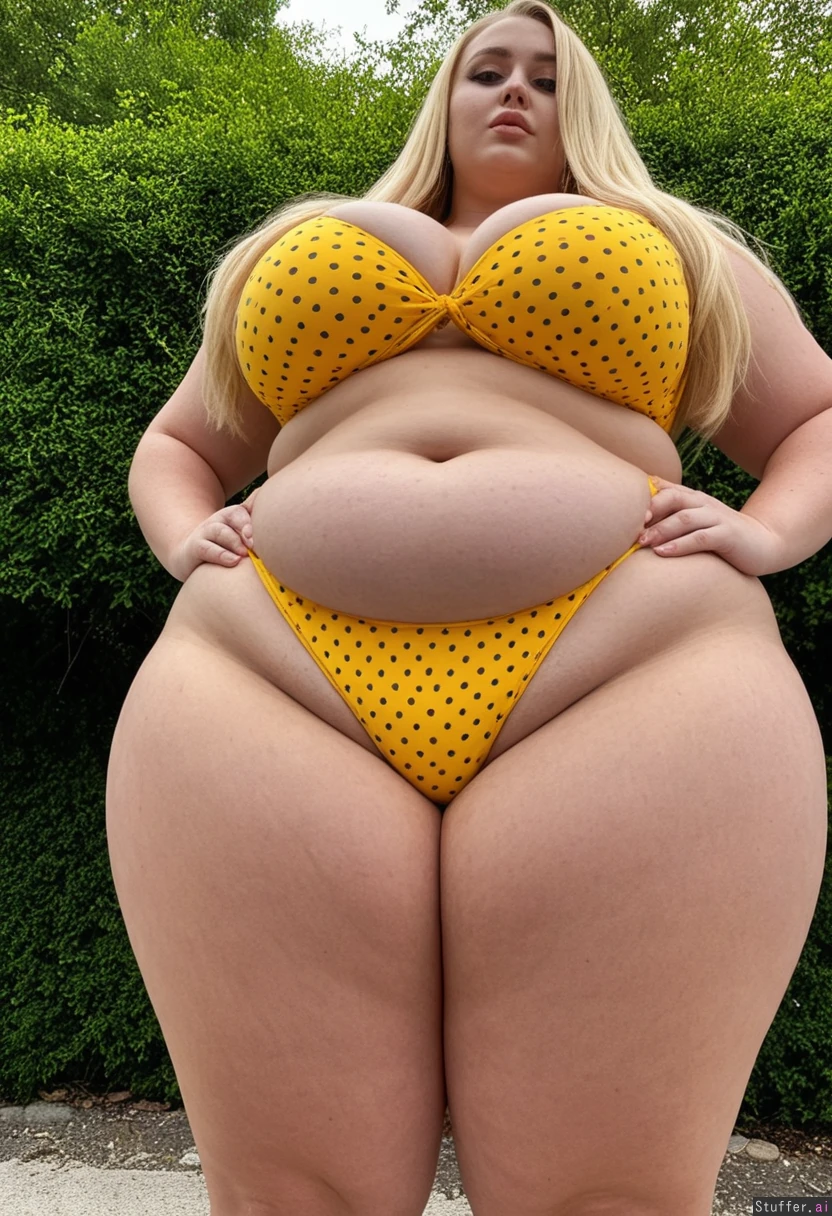 Beautiful girl standing outside Long flowing blonde hair Yellow bikini with black polka dots (((Massive breasts: 0.6))) (((Massive wide hips: 1.8))) (((Massive thick thighs: 1.8)) (Extremely wider hips: 1.9)