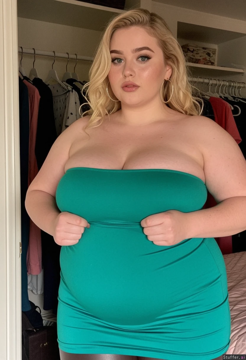 wide_shot, full_body, filmgrain, slightly chubby gorgeous feminine female supermodel, (thick beautiful influencer), (seductive face), mouth slightly agape, perfect teeth , hot seductive face, 20 years old, long eyelashes, blue eyes, long messy blonde hair, (feminine cascading wavy hair), pale skin, heart-shaped round face with small chin, soft stunning features, killer thick legs, thick arms, cute nose, thin eyebrows, earrings, jewelry, (((tight emerald green strapless dress))), (brown leather leggings), (pudgy, soft, doughy, rounder belly: 1.1), curvy, (((very wide love handles))), ((very large muffintop)), rounded curves, mansion, standing in closet, pillows, bulked up, cute pose, focus on hips, bottom heavy meaty bulk,