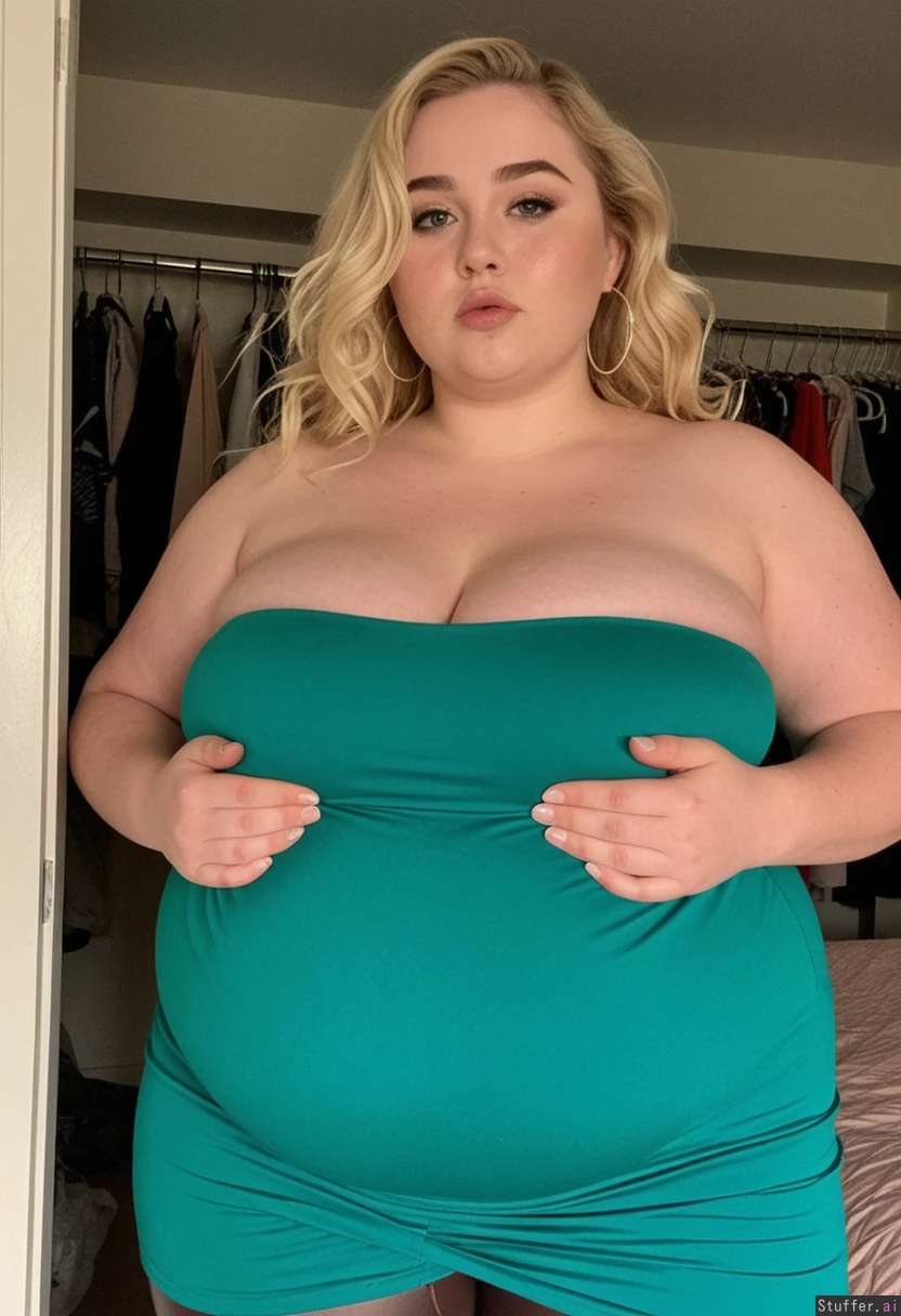 wide_shot, full_body, filmgrain, slightly chubby gorgeous feminine female supermodel, (thick beautiful influencer), (seductive face), mouth slightly agape, perfect teeth , hot seductive face, 20 years old, long eyelashes, blue eyes, long messy blonde hair, (feminine cascading wavy hair), pale skin, heart-shaped round face with small chin, soft stunning features, killer thick legs, thick arms, cute nose, thin eyebrows, earrings, jewelry, (((tight emerald green strapless dress))), (brown leather leggings), (pudgy, soft, doughy, rounder belly: 1.3), curvy, (((very wide love handles))), ((very large muffintop)), rounded curves, mansion, standing in closet, pillows, bulked up, cute pose, focus on hips, bottom heavy meaty bulk,