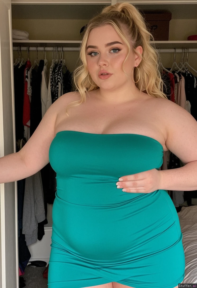 wide_shot, full_body, filmgrain, very chubby gorgeous feminine female supermodel, (thick beautiful influencer), (seductive face), mouth slightly agape, perfect teeth , hot seductive face, 20 years old, long eyelashes, blue eyes, long messy blonde hair, (feminine cascading wavy hair), pale skin, heart-shaped round face with small chin, soft stunning features, killer thick legs, thick arms, cute nose, thin eyebrows, earrings, jewelry, ((tight emerald green strapless dress)), (brown leather leggings), (pudgy, soft, doughy, rounder belly:0.9), curvy, (wide love handles), (large muffintop), rounded curves, mansion, standing in closet, pillows, bulked up, cute pose, focus on hips, bottom heavy meaty bulk,