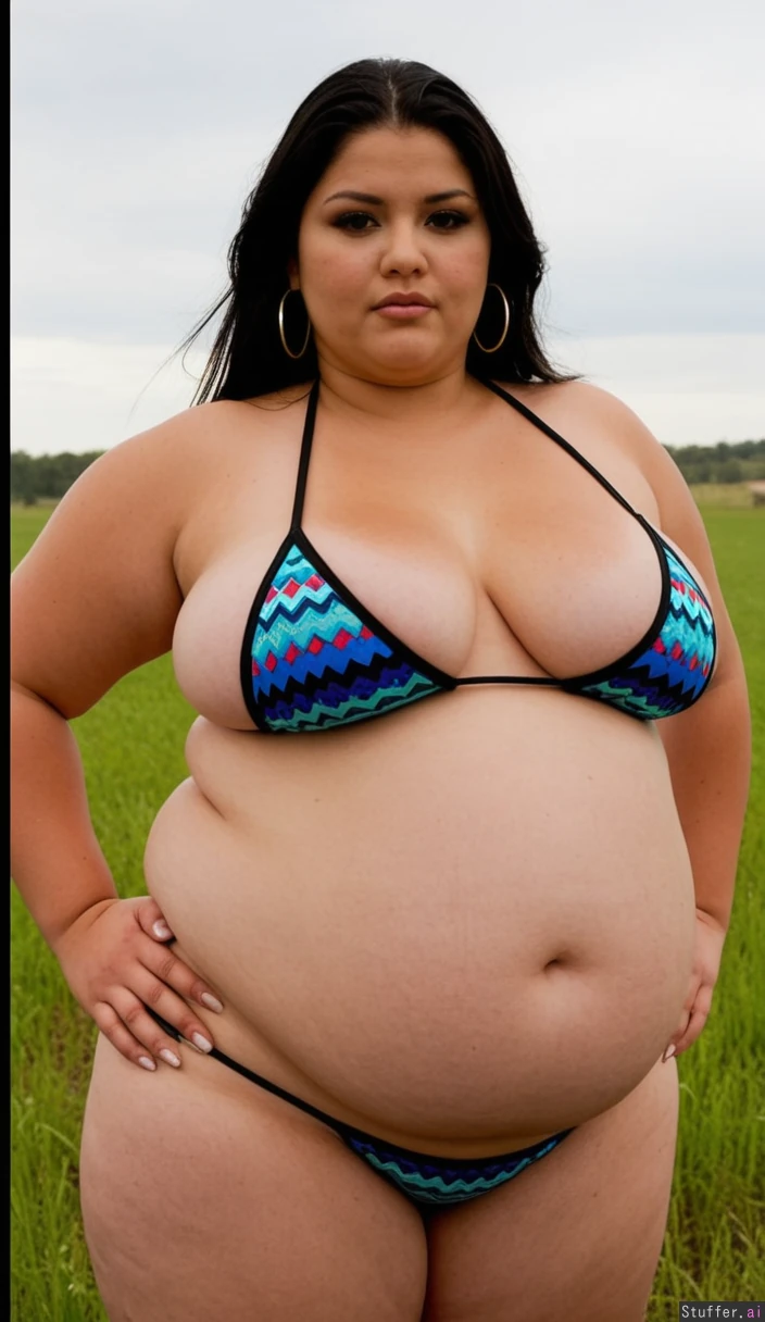 Intimate close-up boudoir shot of one salivatingly juicy lascivious adventurous bold pocahontas native american posing with thick thighs, wearing revealing bikini,seductive hips and confident catwalk strut in beautiful wild field, with flirty eyelashes batting at viewer, under diffused overcast soft, in film grain texture, evoking playful, best quality, (bigger fatter lethargic voluptuous thighs: 1.2) (fatter wider lethargic voluptuous hips: 1.4) (bigger fatter low hanging heavier belly fat: 1.6)