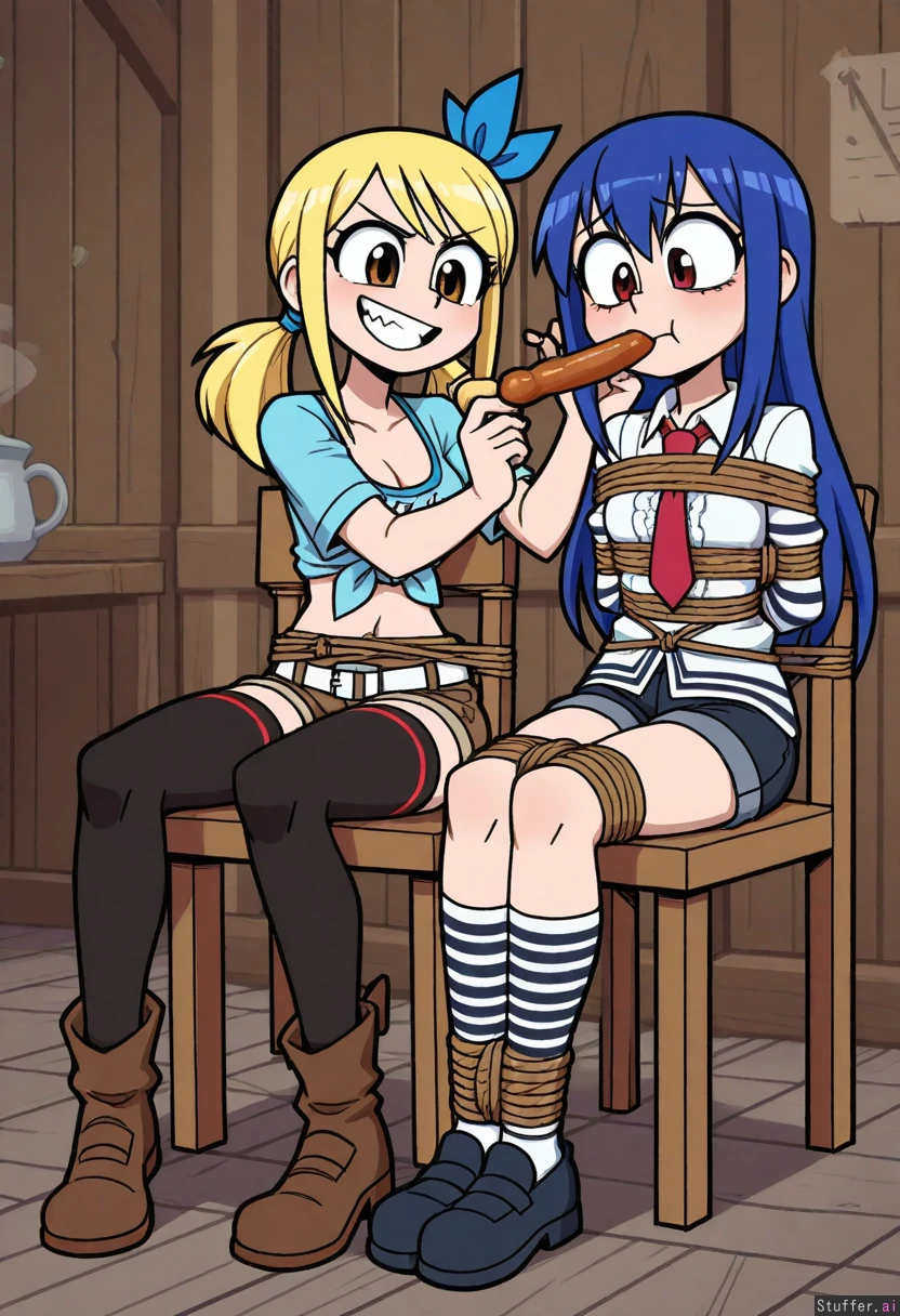 Vanripper_style, 2girls, wendy_marvell, sitting_on_chair, tied_up, legs_aparts, force_feeding, sausages, lucy_heartfilia, grinning