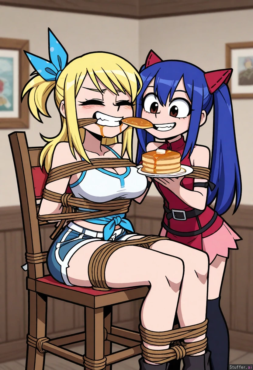 Vanripper_style, 2girls, lucy_heartfilia, grinning, sitting_on_chair, tied_up, legs_aparts, force_feeding, pancakes, wendy_marvell, standing, mouth_stuffed, tired, syrup on lips,