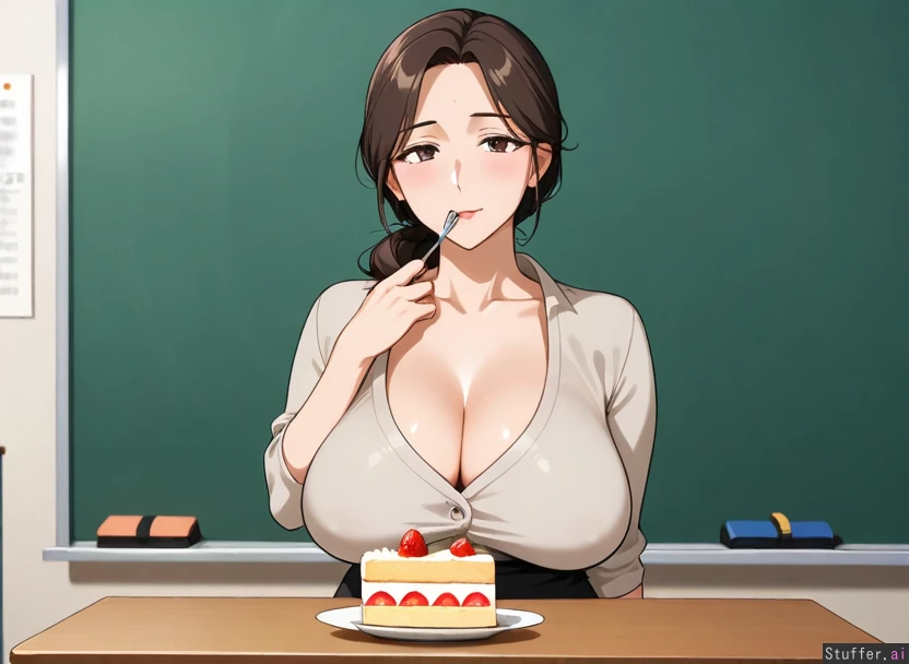 (Mature teacher female:1.4),classroom, medium_breasts, sagging_breasts,romantic_love, (eating_fruitcake)
