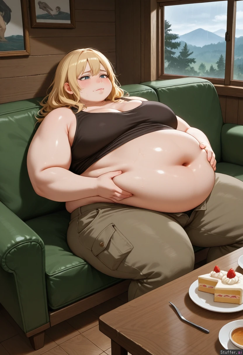 realistic, ultra detailed; 1woman, alone. Hot woman, messy blonde hair, glistening, plump lips, rosy cheeks, blue eyes, fat arms, fat thighs. obese, very fat, incredibly overweight; (massive fat belly:1.3). 350 lbs. Gaining weight, belly getting bigger. In cozy cabin living room with floor-to-ceiling corner windows. (high up above jungle), on peak of mountainous jungle with view of dense rain forest below. (wild tropical rain forest), humid, warm, stormy, raining, foggy. Secluded, alone in wilderness. (no houses in background) Beige and brown clothing. tank top. cake crumbs on face. Unbuttoned pants. Big round belly grows and expands. Very full, too full, ate too much, regretful, tummy ache, belly ache, (upset stomach), in distress, in pain, wincing, groaning. Hiccups. Squeezing bloated belly with hands, regretting overeating. leaning back on couch. Head resting on couch. Low coffee table. (Many half-eaten cakes on table). Resting hands on sides. Fat heavy body sinks into soft couch.