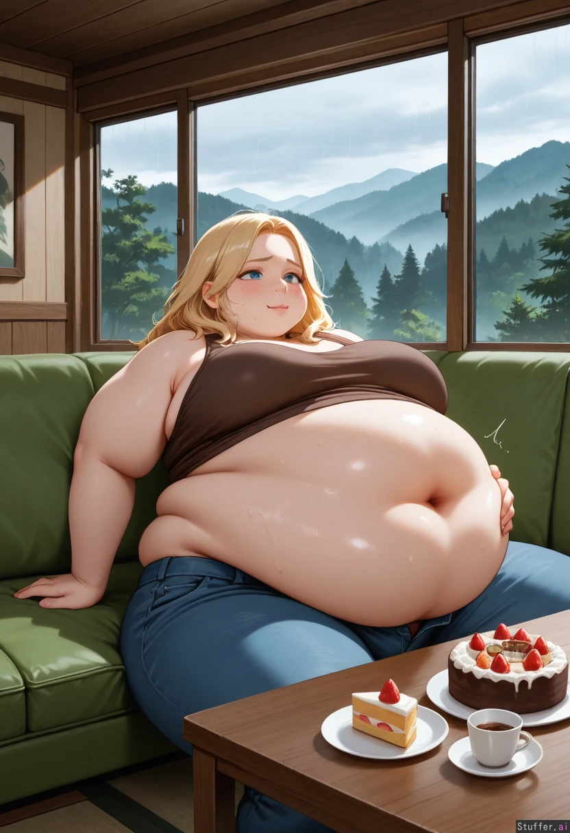 realistic, ultra detailed; 1woman, alone. Hot woman, messy blonde hair, glistening, plump lips, rosy cheeks, blue eyes, fat arms, fat thighs. obese, very fat, incredibly overweight; (massive fat belly:1.3). Gaining weight, belly getting bigger. In cozy cabin living room with floor-to-ceiling corner windows. (high up above jungle), on peak of mountainous jungle with view of dense rain forest below. (wild tropical rain forest), humid, warm, stormy, raining, foggy. Secluded, alone in wilderness. (no houses in background) Beige and brown clothing. tank top. cake crumbs on face. Unbuttoned pants. Big round belly grows and expands. Very full, too full, ate too much, regretful, tummy ache, belly ache, (upset stomach), in distress, in pain, (wincing, groaning). Hiccups. Squeezing bloated belly with hands, regretting overeating. leaning back on couch. Head resting on couch. Low coffee table. (Many half-eaten cakes on table). Resting hands on sides. Fat heavy body sinks deeply into soft couch.
