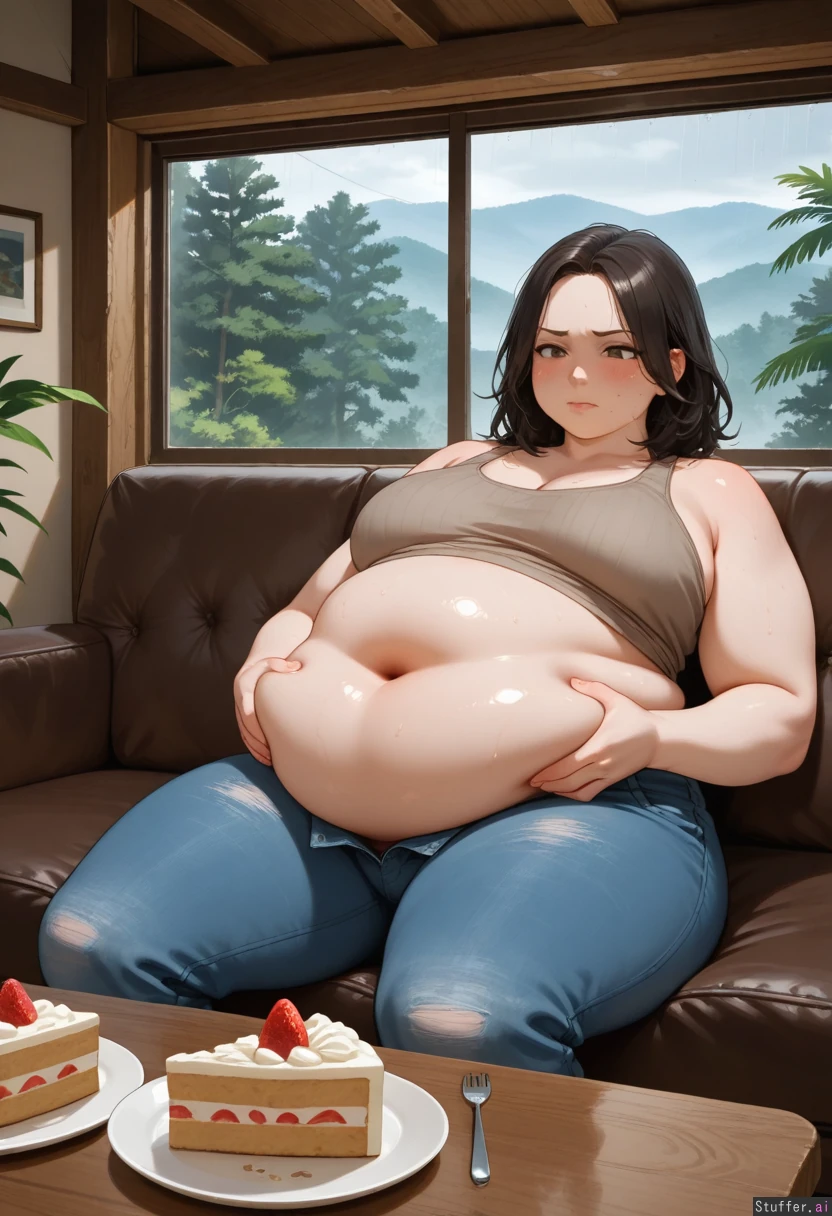 realistic, ultra detailed; 1woman, alone. Hot Latina woman, messy black hair, glistening, plump lips, rosy cheeks, brown eyes, fat arms, fat thighs. obese, very fat, incredibly overweight; (massive fat belly:1.3). Gaining weight, belly getting bigger. In cozy cabin living room with floor-to-ceiling corner windows. (high up above jungle), on peak of mountainous South American jungle with view of dense rain forest below. (wild tropical rain forest), humid, warm, stormy, raining, foggy. Secluded, alone in wilderness. (no houses in background) Beige and brown clothing. tank top. cake crumbs on face. Unbuttoned pants. Big round belly grows and expands. Very full, too full, ate too much, regretful, tummy ache, belly ache, (upset stomach), in distress, in pain, (wincing, groaning). Hiccups. Squeezing bloated belly with hands, regretting overeating. leaning back on couch. Head resting on couch. Low coffee table. (Many half-eaten cakes on table). Resting hands on sides. Fat ass sinks deeply into soft couch.