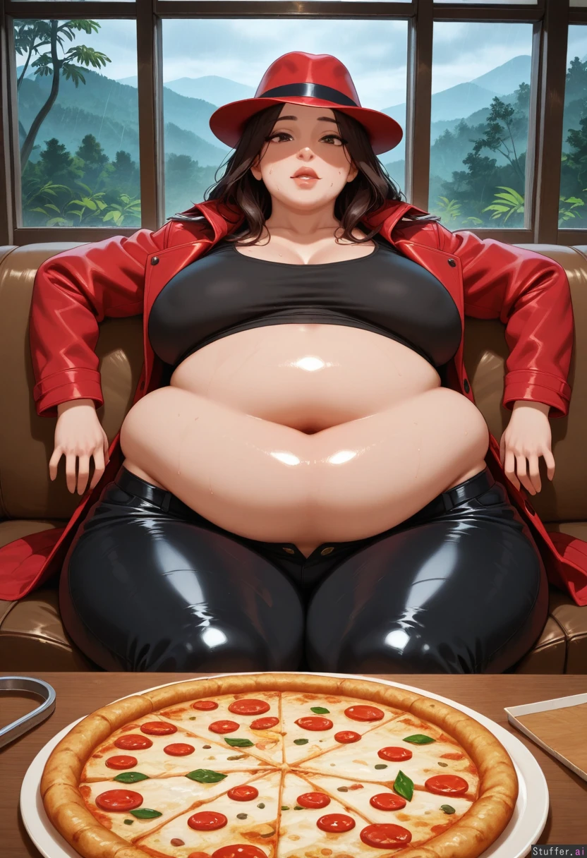 realistic, ultra detailed; Dim noir lighting. 1woman, alone. Hot (Afro-Latina woman), (brown skin), thick wavy dark brown hair, long hair, glistening, plump lips, fat arms, fat thighs. double chin. obese, very fat, incredibly overweight; (massive fat belly:1.3). Gaining weight, belly getting bigger. Wide hips, wide body. In cozy cabin living room with floor-to-ceiling corner windows. (high up above jungle), on peak of mountainous South American jungle with view of dense rain forest below. (wild tropical rain forest), humid, warm, stormy, raining, foggy. Secluded, (no houses in background). Black tank top. pizza crumbs on face. (Unbuttoned) black leather pants. Big round belly grows and expands. Very full, too full, ate too much, regretful, (tummy ache, belly ache), in distress, in pain, (wincing, groaning). Hiccups. regretting overeating. leaning back in couch. Low coffee table. (pizza on table). Eating pizza. Fat ass sinks deeply into soft couch. Carmen Sandiego. (Red trenchcoat). oversized red fedora. Looking at viewer, caught, slightly surprised.