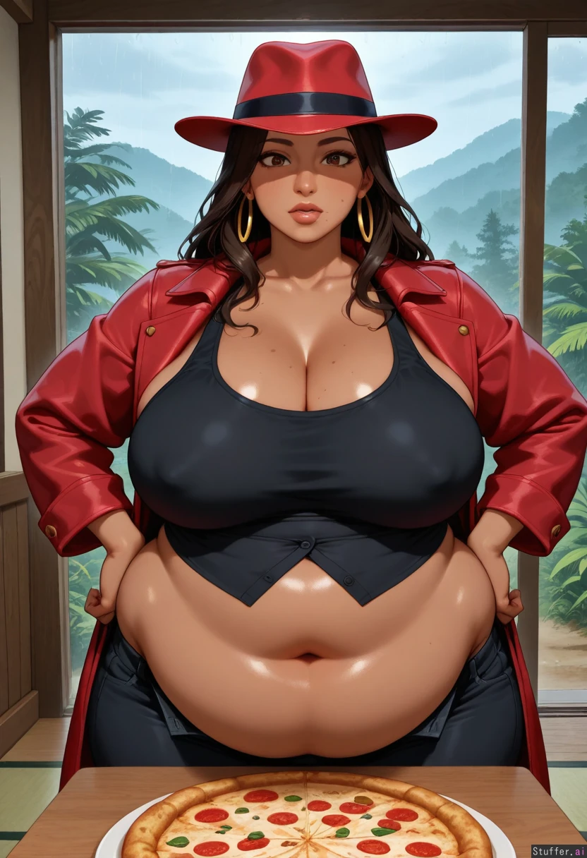 realistic, ultra detailed; Dim lighting. 1woman, alone. Hot Black Latina woman, dark tan skin, thick wavy dark brown hair, long hair, glistening, plump lips, fat arms, fat thighs. double chin. Mature. very obese, very fat, incredibly overweight; (massive fat belly:1.3). Gaining weight, belly getting bigger. Wide hips, wide body. In cozy cabin living room with floor-to-ceiling corner windows. (high up above jungle), on peak of mountainous South American jungle with view of dense rain forest below. (wild tropical rain forest), humid, warm, stormy, raining, foggy. Secluded, (no houses in background). Black tank top. pizza crumbs on face. (Unbuttoned) black pants. Big round belly grows and expands. Low coffee table. (pizza on table). Standing, hands on hips. Full bloated Heavy belly hanging. Enormous fat Belly hangs over sides of pants. Carmen Sandiego. (Red trenchcoat). (large red fedora). Hoop earrings. Looking at viewer, caught, surprised.