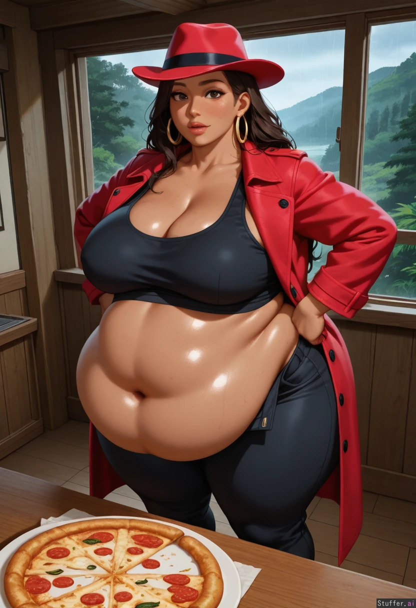 realistic, ultra detailed; Dim lighting. 1woman, alone. Hot Black Latina woman, dark tan skin, thick wavy dark brown hair, long hair, glistening, plump lips, fat arms, fat thighs. double chin. Mature. very obese, very fat, incredibly overweight; (massive fat belly:1.3). Gaining weight, belly getting bigger. Wide hips, wide body. In cozy cabin living room with floor-to-ceiling corner windows. (high up above jungle), on peak of mountainous South American jungle with view of dense rain forest below. (wild tropical rain forest), humid, warm, stormy, raining, foggy. Secluded, (no houses in background). Black tank top. pizza crumbs on face. (Unbuttoned) black pants. Big round belly grows and expands. Low coffee table. (pizza on table). Standing, hands on hips. Full bloated Heavy belly hanging. Enormous fat Belly hangs over sides of pants. fat ass. Carmen Sandiego. (Red trenchcoat). (large red fedora). Hoop earrings. Looking at viewer, caught, surprised.