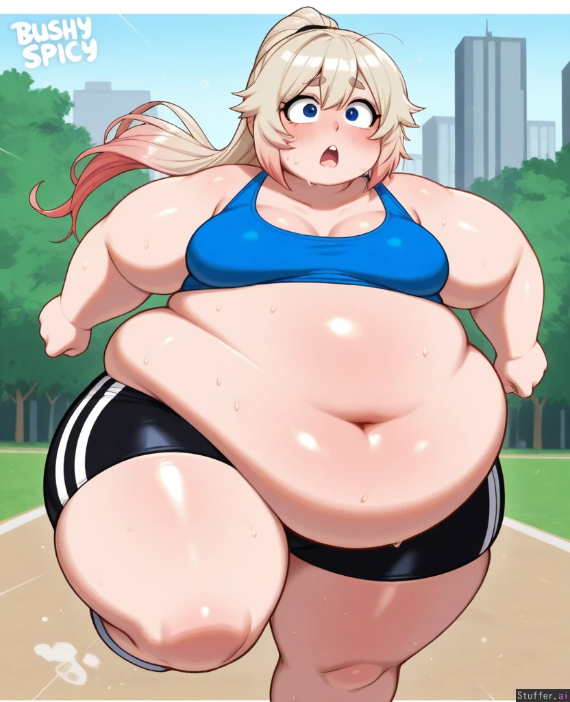 (rocksolidart:1.2), (merunyaa:1.2), (usa37107692:1.2), (ohasi_art:1.2), (blushyspicy:1.2), park, platinum_blonde_hair, (red gradient_hair:1.2), ponytail, blue_eyes, blue_tank_top, (sweating:1.4), bike_shorts, (exhausted open_mouth), (running), (solo), (1girl), (mature_woman), (morbidly_obese:1.2), (fat:1.2), (immobile:1.4), (double_chin:1.4), (small_breasts:1.2), (fat_arms), (huge_belly), (sagging_belly), (bloated_belly), (fat_legs), (belly_blush:1.2),