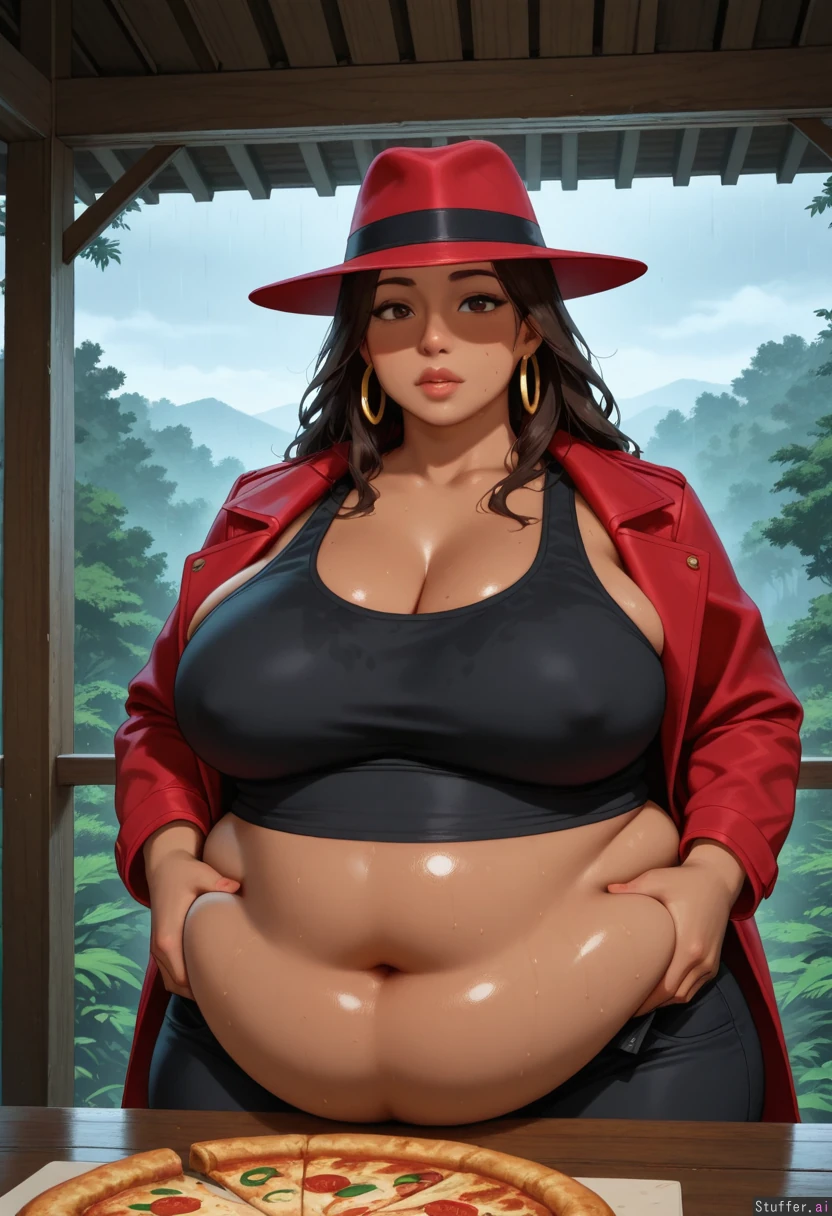 realistic, ultra detailed; Dim lighting. 1woman, alone. Hot Black Latina woman, dark tan skin, thick wavy dark brown hair, long hair, glistening, plump lips, fat arms, fat thighs. double chin. Mature. big 1980's hairstyle. very obese, very fat, incredibly overweight; (massive fat belly:1.3). Gaining weight, belly getting bigger. Wide hips, wide body. In cabin (high up above jungle), on peak of mountainous South American jungle with view of dense rain forest below. (wild tropical rain forest), humid, warm, stormy, raining, foggy. Secluded, (no houses in background). Black tank top. pizza crumbs on face. (Unbuttoned) black pants. Big round belly grows and expands. Low coffee table. (pizza on table). Standing, feeling heavy. Full bloated Heavy belly hanging. Enormous fat Belly hangs over sides of pants. fat ass. adjusting waist of pants. Carmen Sandiego. (Red trenchcoat). (large red fedora). Hoop earrings. Looking at viewer, surprised.