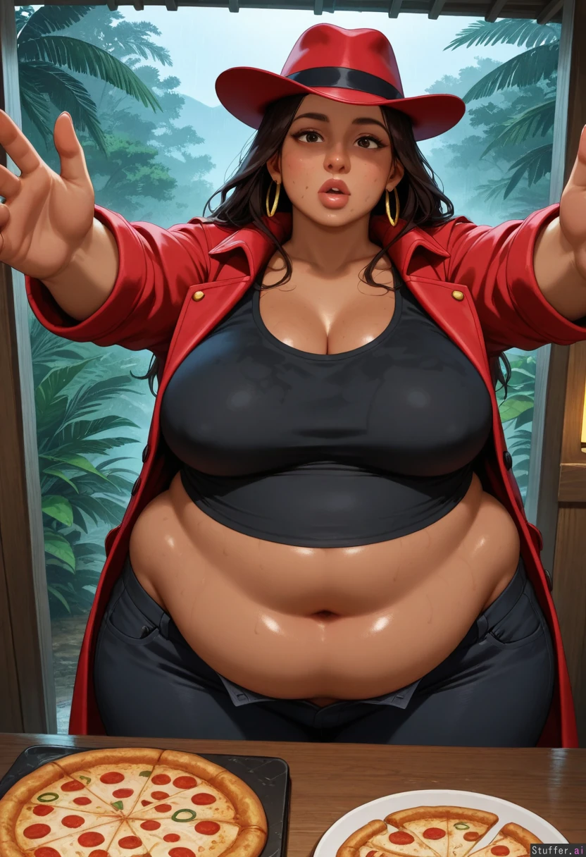 realistic, ultra detailed; Dim lighting. 1woman, alone. Hot Black Latina woman, dark tan skin, thick wavy dark brown hair, long hair, glistening, plump lips, fat arms, fat thighs. double chin. Mature. big 1980's hairstyle. very obese, very fat, incredibly overweight; (massive fat belly:1.3). Gaining weight, belly getting bigger. Wide hips, wide body. In cabin (high up above jungle), on peak of mountainous South American jungle with view of dense rain forest below. (wild tropical rain forest), humid, warm, stormy, raining, foggy. Secluded, (no houses in background). Black tank top. pizza crumbs on face. (Unbuttoned) black pants. Big round belly grows and expands. Low coffee table. (pizza on table). Standing, feeling heavy. Full bloated Heavy belly hanging. Enormous fat Belly hangs over sides of pants. fat ass. reaching out hands. Carmen Sandiego. (Red trenchcoat). (large red fedora). Hoop earrings. Looking at viewer, shocked. discovered hideout.