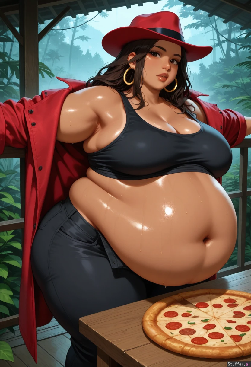 realistic, ultra detailed; Dim lighting. 1woman, alone. Hot Black Latina woman, dark tan skin, thick wavy dark brown hair, long hair, glistening, plump lips, fat arms, fat thighs. double chin. Mature. big 1980's hairstyle. very obese, very fat, incredibly overweight; (massive fat belly:1.3). Gaining weight, belly getting bigger. Wide hips, wide body. In cabin (high up above jungle), on peak of mountainous South American jungle with view of dense rain forest below. (wild tropical rain forest), humid, warm, stormy, raining, foggy. Secluded, (no houses in background). Black tank top. (Unbuttoned) black pants. Big round belly grows and expands. Low coffee table. (pizza on table). Standing, feeling heavy. Full bloated Heavy belly hanging. Enormous fat Belly hangs over sides of pants. fat ass. arms out wide, trying to escape. Carmen Sandiego. (Red trenchcoat). (large red fedora). Hoop earrings. Looking at viewer, shocked. discovered hideout.