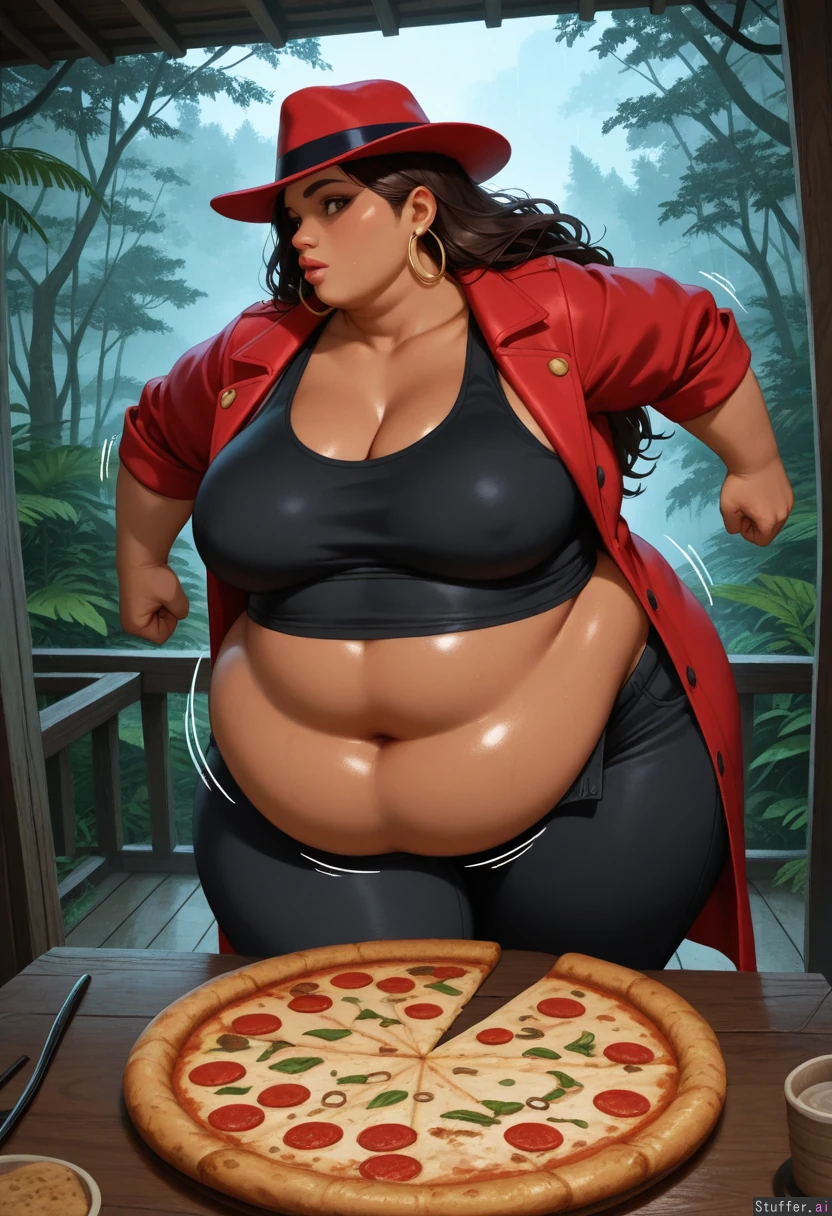 realistic, ultra detailed; Dim lighting. 1woman, alone. Hot Black Latina woman, dark tan skin, thick wavy dark brown hair, long hair, glistening, plump lips, fat arms, fat thighs. double chin. Mature. big 1980's hairstyle. very obese, very fat, incredibly overweight; (massive fat belly:1.3). Gaining weight, belly getting bigger. Wide hips, wide body. In cabin (high up above jungle), on peak of mountainous South American jungle with view of dense rain forest below. (wild tropical rain forest), humid, warm, stormy, raining, foggy. Secluded, (no houses in background). Black tank top. (Unbuttoned) black pants. Big round belly grows and expands. Low coffee table. (pizza on table). feeling heavy. Full bloated Heavy belly hanging. Enormous fat Belly hangs over sides of pants. fat ass. running away, trying to escape. fat belly wobbles, action lines. profile view. Carmen Sandiego. (Red trenchcoat). (large red fedora). Hoop earrings. Looking at viewer, shocked. discovered hideout.
