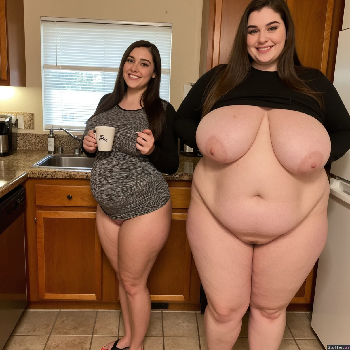 Standing in modern kitchen with soft lighting, Dark brown hair, long hair, brown eyes,, blushing red cheeks, smiling, baggy black long sleeve shirt, no pants, flip flops, eyeliner, baggy eyeshadow, Smiling, 20 years old, tall, hyper massively curvy, extremely obese gainer feedee, holding cup of coffee, very tall girl, acne (((Massive breasts: 1.0) (((Massive wide hips: 0.6))) (((Massive thick thighs: 0.6), seductive pose, perfect model skinny face, giantess, thick Hyper distended fat belly Impossibly huge vore belly Bigger hips weight gain, fuller breast weight gain, tighter dress, bigger hips weight gain, wider body weight gain, huge weight gain, ((((fatter hips weight gain))))1.9