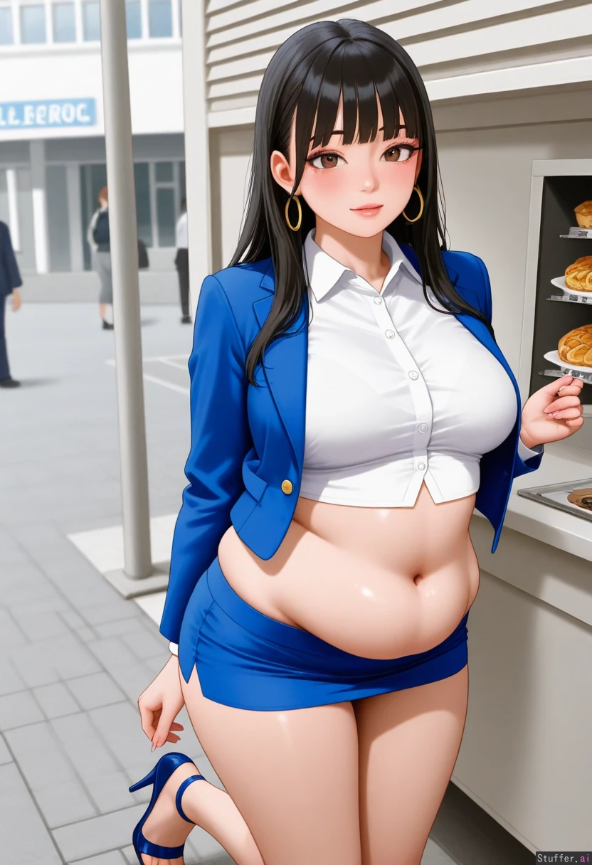 1girl photorealistic beautiful makeup blush eyeshadow eyeliner long_eyelashes lipgloss mascara long_hair black_hair brown_eyes happy photorealistic blunt_bangs hoop_earrings fit_female ( chubby:1.4) heavy_blush office_lady blue_footwear stiletto_heels toeless_footwear microskirt blue_skirt ( white button shirt) blue_jacket bloated_belly street cityscape food_stand standing