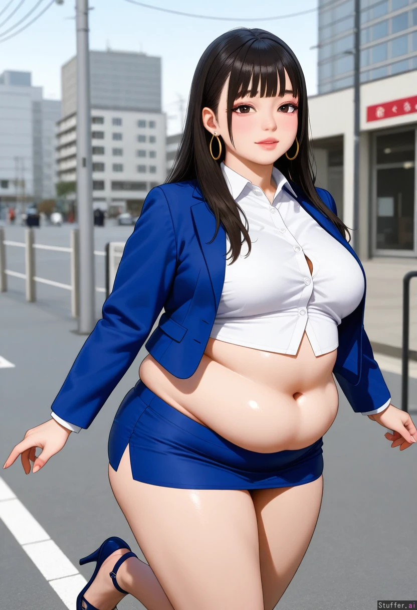 1girl photorealistic beautiful makeup blush eyeshadow eyeliner long_eyelashes lipgloss mascara long_hair black_hair brown_eyes happy photorealistic blunt_bangs hoop_earrings fit_female ( chubby:1.6) heavy_blush office_lady blue_footwear stiletto_heels toeless_footwear microskirt blue_skirt ( white button shirt) blue_jacket bloated_belly street cityscape (( walking))