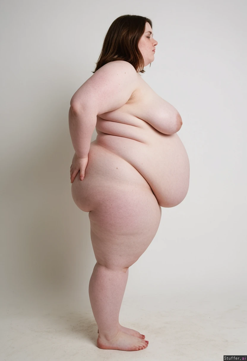 Stunning brunette model, short hair, fit lean body, standing, bare feet, fashion photography set, white background, profile view, pale skin, (Obese flabby with cellulite and ugly face and long hair:1.25)