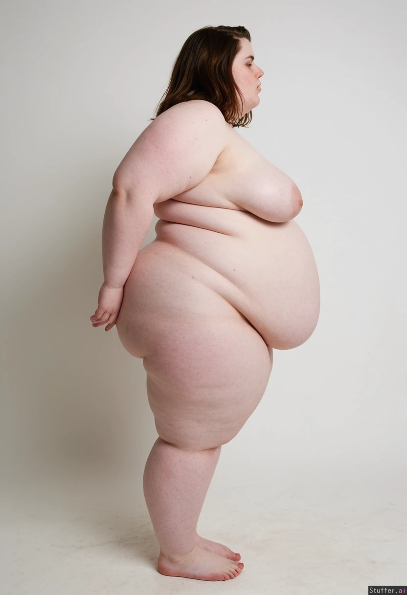 Stunning brunette model, short hair, fit lean body, standing, bare feet, fashion photography set, white background, profile view, pale skin,