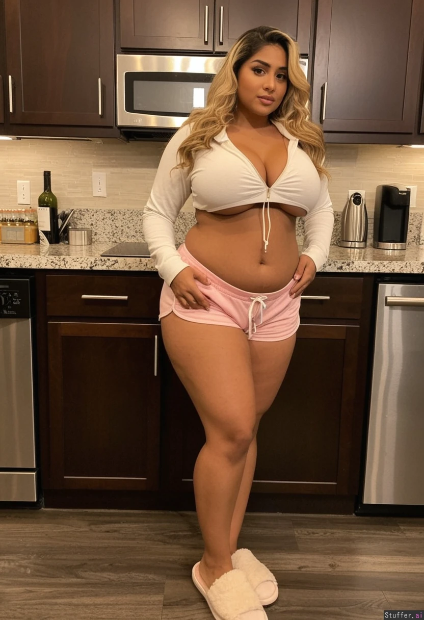 Beautiful tan Indian influencer blonde highlights on black wavy hair and an skinny figure, eyeliner, belly crease, small belly, South Indian, skinny, fit, in shape, skinny arms, skinny legs, thin thighs, toned butt, thin calves, slender ankles, small boobs, small cleavage, angular jawline, ((dark tanned skin)) ((caramel skin color)) gorgeous, model face, angular jawline, full face of makeup, gold jewelry warm lighting ((thin hips)) (((soft creased belly))) Clothing A gorgeous (beautiful popular girl face) woman with long wavy hair and tan skin wearing a cream cropped hoodie with washed pink athletic shorts and white fuzzy slippers. Standing in a kitchen. Setting Nice cozy kitchen, she is looking at viewer (bigger fatter lethargic voluptuous thighs: 1.2) (fatter wider lethargic voluptuous hips: 1.2)