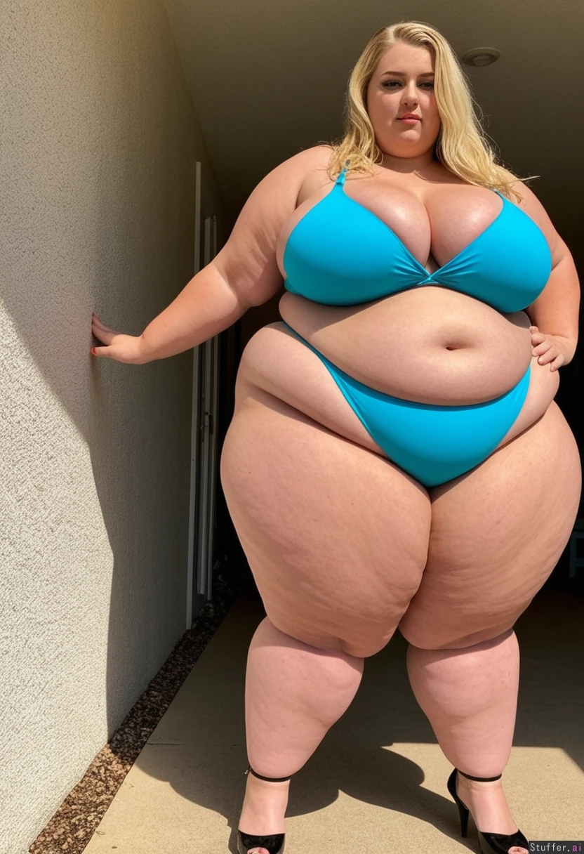 Woman standing outside on sunny day gaining weight Wearing teal bikini Black high heels Tan skin Blue eyes Long blonde hair (((((Hyper Massive very extra wide plump fat giant thick curvy hips)) 1.7)))
