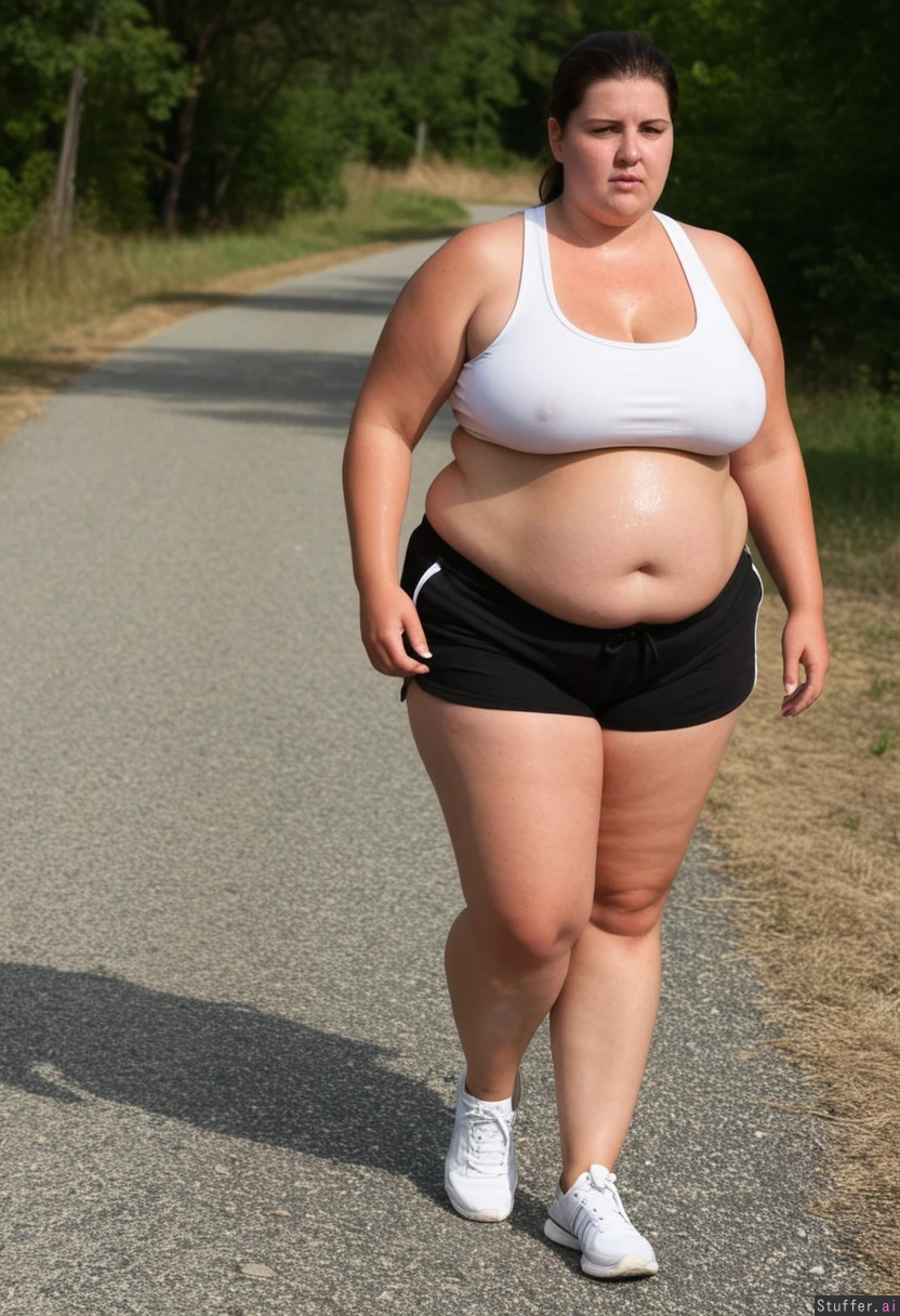 Thin brunette walking towards viewer, white crop top, black gym shorts, white sneakers, front view, country pathway, perky small tits, defined jawline, (Obese tired sweating:1.5)