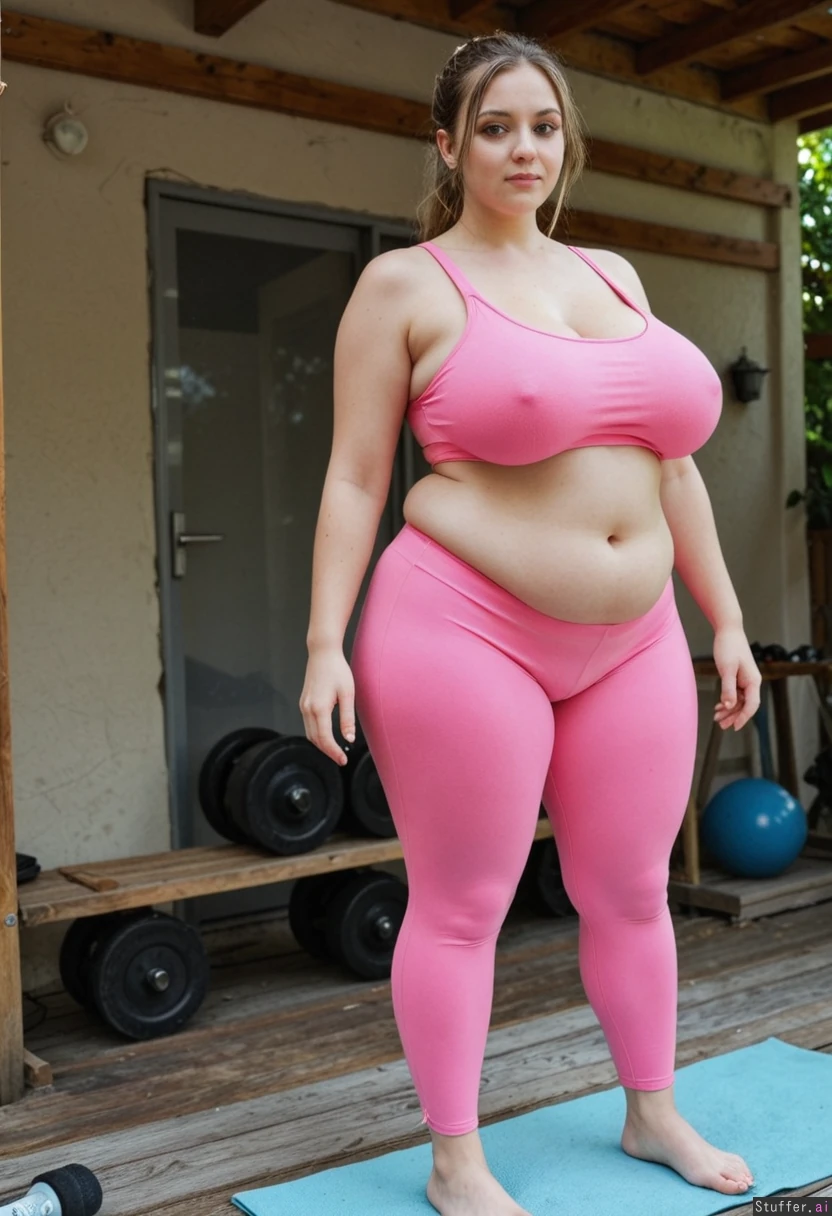 Curvy woman standing outside in bright sunlight Pink tight yoga pants and top 4k high resolution (((Skinny_waist, fat gigantic massive_hips)))