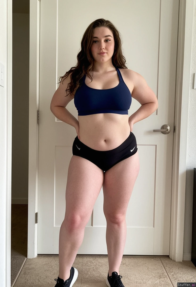 Full body, One hot girl, standing in a white room next to a door, single screen, showing her front body to the camera, looking in the camera, Wearing a dark blue nike sport bra with tight black volleyball shorts, Dark wavy brown long hair, pale skin, 18 year old, Super cute face, super fat but ultra attractive round chubby face, Short 100 centimeter body, giant body, Enourmous curvy tall body, Tall long big wide musclelegs, Super ultra curvy wide hips, Insane Pear shaped body, Skinny but fit curvy body, Flat belly, Small flatboobs,