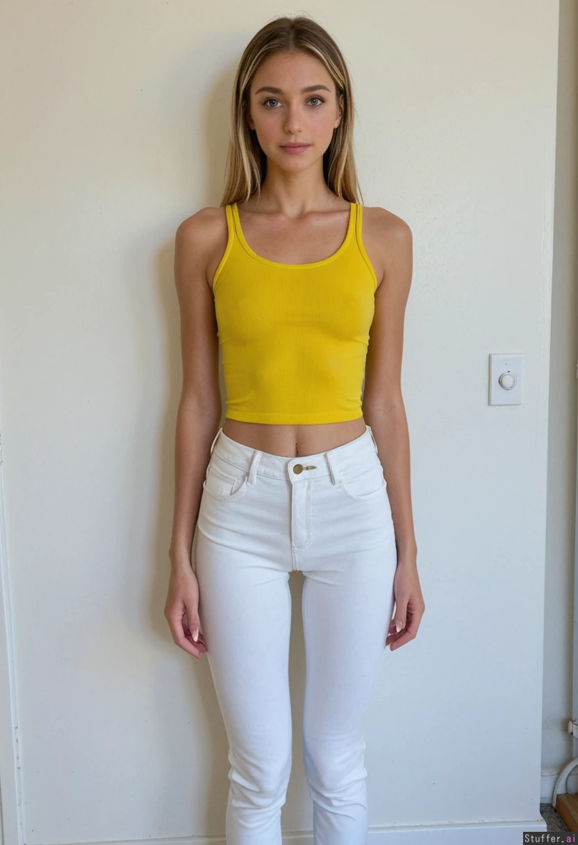Instagram model Tan skin Slim body Tight white jeans Tight yellow tank top