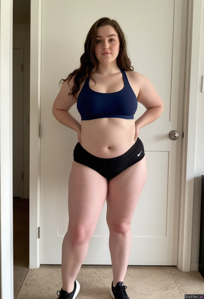 Full body, One hot girl, standing in a white room next to a door, single screen, showing her front body to the camera, looking in the camera, Wearing a dark blue nike sport bra with tight black volleyball shorts, Dark wavy brown long hair, pale skin, 18 year old, Super cute face, super fat but ultra attractive round chubby face, Short 100 centimeter body, giant body, Enourmous curvy tall body, Tall long big wide fat legs, Super ultra curvy pear shape wide hips, Insane Pear shaped body, Skinny but fit curvy body, Flat belly, Small flatboobs, Super Small waist,