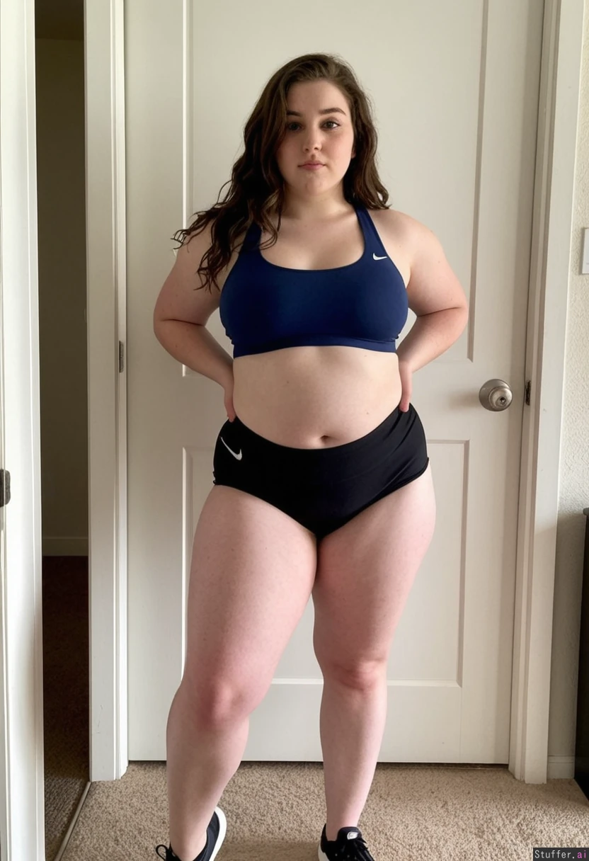 Full body, One hot girl, standing in a white room next to a door, single screen, showing her front body to the camera, looking in the camera, Wearing a dark blue nike sport bra with super tight high waisted black volleyball shorts, Dark wavy brown long hair, pale skin, 18 year old, Super cute face, super fat but ultra attractive round chubby face, Short 10 centimeter body, Super short and curvy body, Short big wide fat legs, Super ultra curvy pear shape super ultra wide hips, Insane rounded wude Pear shaped body, Skinny but fit curvy body, Belly, Small saggy chubby flatboobs, Super Small waist,