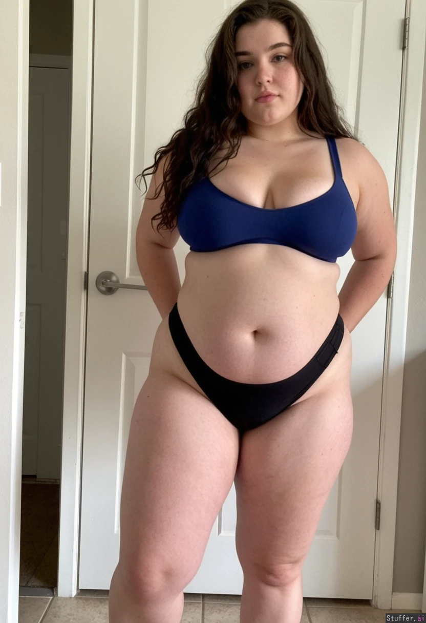 Full body, One hot girl, standing in a white room next to a door, single screen, showing her front body to the camera, looking in the camera, Nude, holding a ripped dark blue nike sport bra with super tight high waisted black volleyball shorts, Dark wavy brown long hair, pale skin, 18 year old, Super cute face, super fat but ultra attractive round chubby fat face, big fat underchin, Short 10 centimeter body, Super short and curvy body, Short big wide fat legs, Super ultra curvy pear shape super ultra wide hips, Insane rounded wude Pear shaped body, Skinny but fit curvy body, Hanging fat Belly, Small saggy chubby flatboobs, Super Small waist, Round fat big wide body,