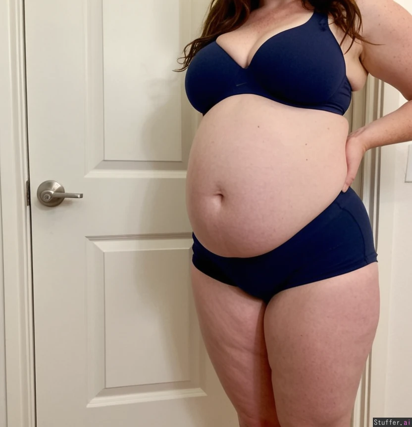 Full body and face, One hot girl, standing in a white room next to a door, single screen, showing her front body to the camera, looking in the camera with face, Wearing a dark blue nike sport bra an tight vollyball shorts, Dark wavy brown long hair, pale skin, 45 year old, Super cute face, ultra attractive super thin model face, Fat legs, fat puffy vagina, super big round ssbbw belly hanging over pussy, big hanging saggy boobs,