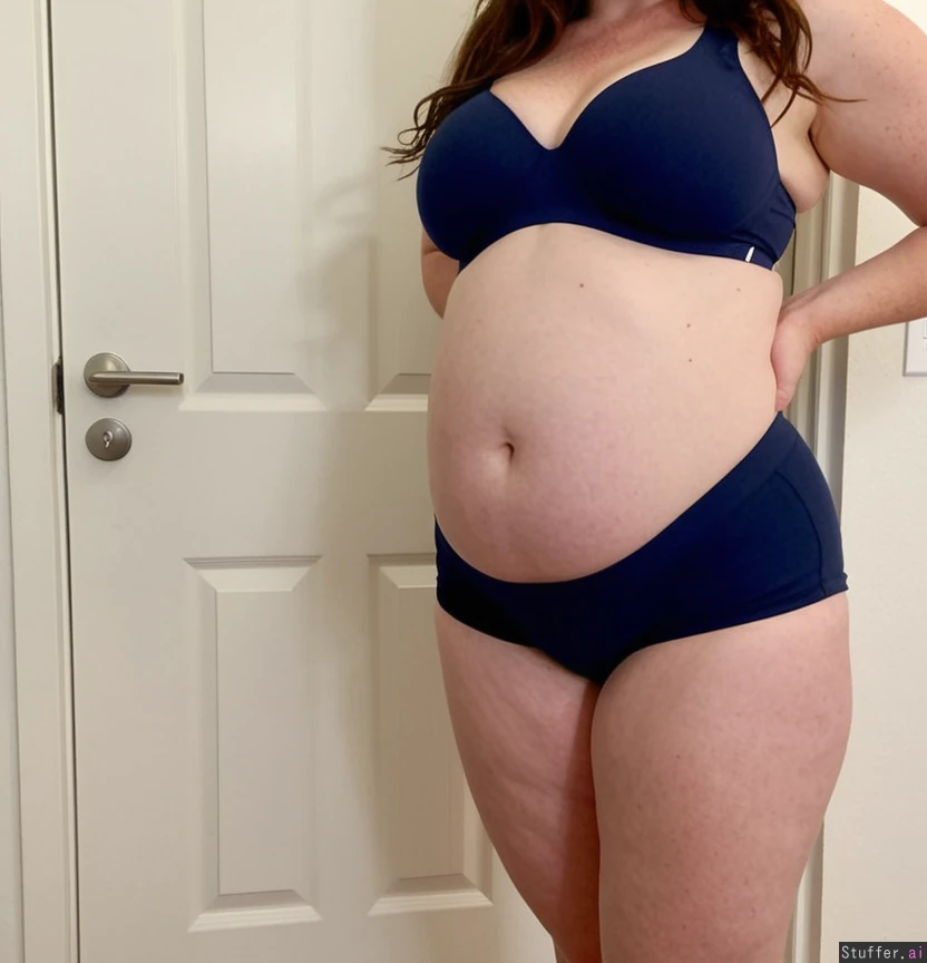 Full body and face, One hot girl, standing in a white room next to a door, single screen, showing her front body and face to the camera, looking in the camera with face, Wearing a dark blue nike sport bra an tight vollyball shorts, Dark wavy brown long hair, pale skin, 45 year old, Super cute face, ultra attractive super thin model face, Fat legs, fat puffy vagina, super big round ssbbw belly hanging over pussy, big hanging saggy boobs,