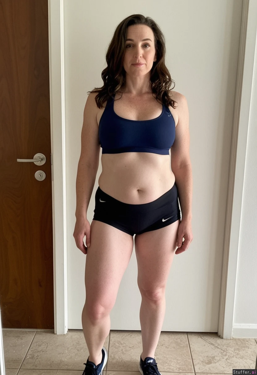 Full body, One hot girl, standing in a white room next to a door, single screen, showing her front body to the camera, looking in the camera, Wearing a dark blue nike sport bra with tight black volleyball shorts, Dark wavy brown long hair, pale skin, 45 year old, Super cute face, ultra attractive face, Saggy out of shape fat body,