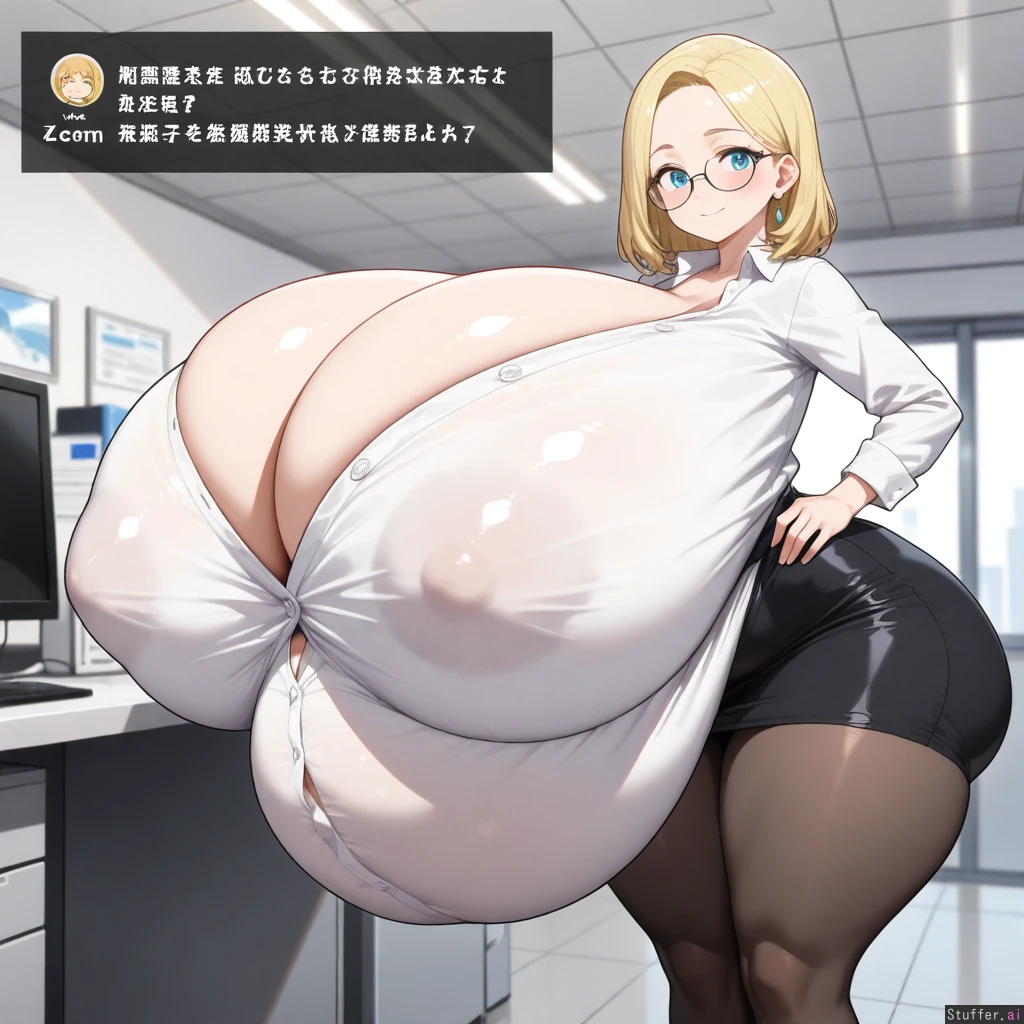 best quality), (high rating), absurd 4res, high res, detailed, ultra quality, ((high quality)), masterpiece, (ultra high resolution), anime style, stunning beauty, detailed face, intricate detail, not blurry, sophisticated detail, exquisite detail, absurd resolution, correct anatomy, 8k, (((highly detailed face)), highly detailed skin texture, detailed textures, definition lines, soft colors, full color, highly detailed face, beautiful face, glossy realistic skin, gorgeous, detailed face, detailed eyes, detailed mouth, ((zdemian,)) 1girl, solo, ((huge hyperpregnant belly)), ((, small height, petite,blue eyes, blonde medium hair, perfect anatomy, perfect colthes, perfect prosition, )), (((,huge body,thick thighs, fat legs, hyper huge round butt, wide hips, cleavage, ))), (((( gigantic breast ballooning, spherical breast, hyper_gigantic_round_breast,)))), ((( covered ass, covered breast, covered belly ))), ((torso breast, erect nipples, head sinking in her body, white buttoned shirt, black pencil skirt, pantyhose, office, small smile, Standing, heavy blush, earrings, glasses,)), close of the viewer,