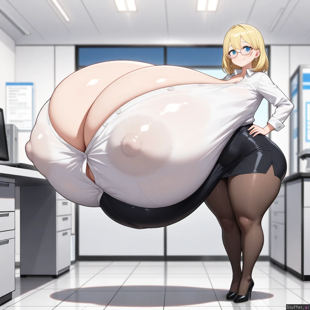 best quality), (high rating), absurd 4res, high res, detailed, ultra quality, ((high quality)), masterpiece, (ultra high resolution), anime style, stunning beauty, detailed face, intricate detail, not blurry, sophisticated detail, exquisite detail, absurd resolution, correct anatomy, 8k, (((highly detailed face)), highly detailed skin texture, detailed textures, definition lines, soft colors, full color, highly detailed face, beautiful face, glossy realistic skin, gorgeous, detailed face, detailed eyes, detailed mouth, ((zdemian,)) 1girl, solo, ((huge hyperpregnant belly)), ((, small height, petite,blue eyes, blonde medium hair, perfect anatomy, perfect colthes, perfect prosition, )), (((,huge body,thick thighs, fat legs, hyper huge round butt, wide hips, cleavage, ))), (((( gigantic breast ballooning, spherical breast, hyper_gigantic_round_breast,)))), ((( covered ass, covered breast, covered belly ))), ((torso breast, erect nipples, head sinking in her body, white buttoned shirt, black pencil skirt, pantyhose, office, small smile, Standing, heavy blush, earrings, glasses,)), close of the viewer, full body