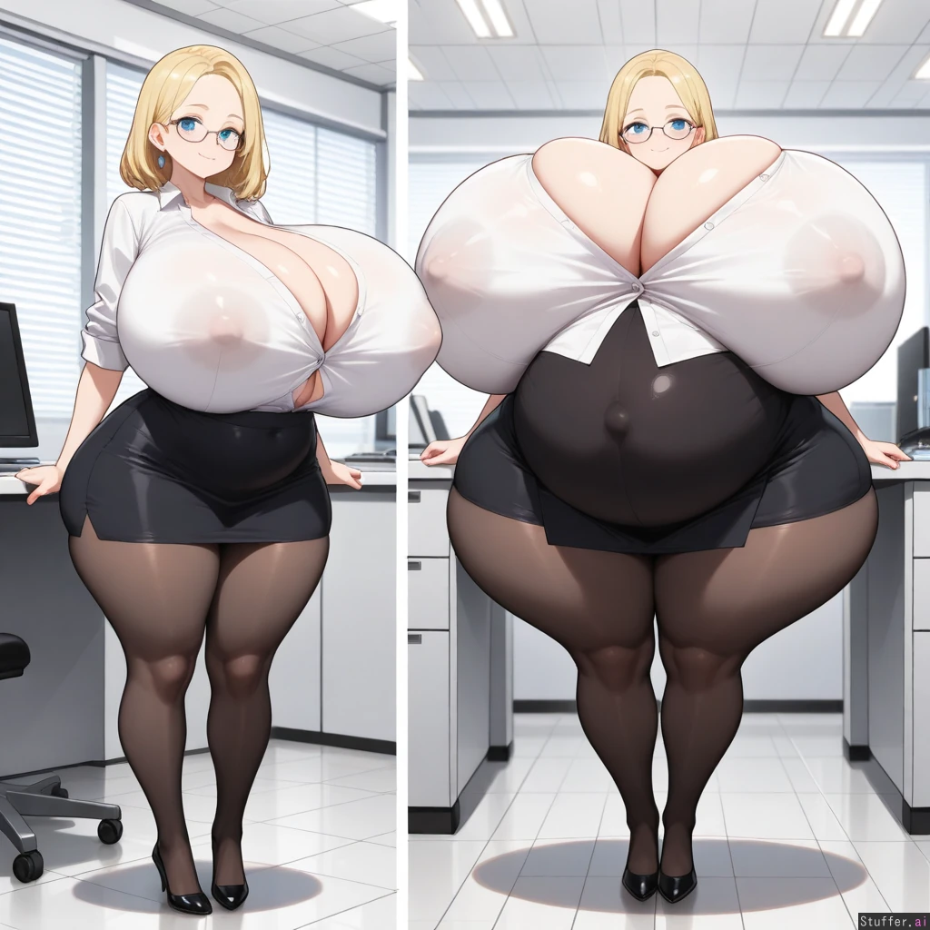 best quality), (high rating), absurd 4res, high res, detailed, ultra quality, ((high quality)), masterpiece, (ultra high resolution), anime style, stunning beauty, detailed face, intricate detail, not blurry, sophisticated detail, exquisite detail, absurd resolution, correct anatomy, 8k, (((highly detailed face)), highly detailed skin texture, detailed textures, definition lines, soft colors, full color, highly detailed face, beautiful face, glossy realistic skin, gorgeous, detailed face, detailed eyes, detailed mouth, ((zdemian,)) 1girl, solo, ((huge hyperpregnant belly)), ((, small height, petite,blue eyes, blonde medium hair, perfect anatomy, perfect colthes, perfect prosition, )), (((,huge body,thick thighs, fat legs, hyper huge round butt, wide hips, cleavage, ))), (((( gigantic breast ballooning, spherical breast, hyper_gigantic_round_breast,)))), ((( covered ass, covered breast, covered belly ))), ((torso breast, erect nipples, head sinking in her body, white buttoned shirt, black pencil skirt, pantyhose, office, small smile, Standing, heavy blush, earrings, glasses,)), close of the viewer, full body