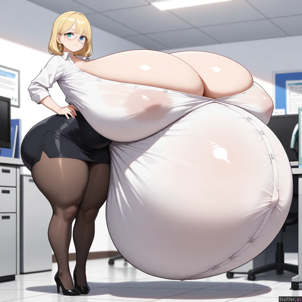 best quality), (high rating), absurd 4res, high res, detailed, ultra quality, ((high quality)), masterpiece, (ultra high resolution), anime style, stunning beauty, detailed face, intricate detail, not blurry, sophisticated detail, exquisite detail, absurd resolution, correct anatomy, 8k, (((highly detailed face)), highly detailed skin texture, detailed textures, definition lines, soft colors, full color, highly detailed face, beautiful face, glossy realistic skin, gorgeous, detailed face, detailed eyes, detailed mouth, ((zdemian,)) 1girl, solo, ((huge hyperpregnant belly)), ((, small height, petite,blue eyes, blonde medium hair, perfect anatomy, perfect colthes, perfect prosition, )), (((,huge body,thick thighs, fat legs, hyper huge round butt, wide hips, cleavage, ))), (((( gigantic breast ballooning, spherical breast, hyper_gigantic_round_breast,)))), ((( covered ass, covered breast, covered belly ))), ((torso breast, erect nipples, head sinking in her body, white buttoned shirt, black pencil skirt, pantyhose, office, small smile, Standing, heavy blush, earrings, glasses,)), close of the viewer, full body