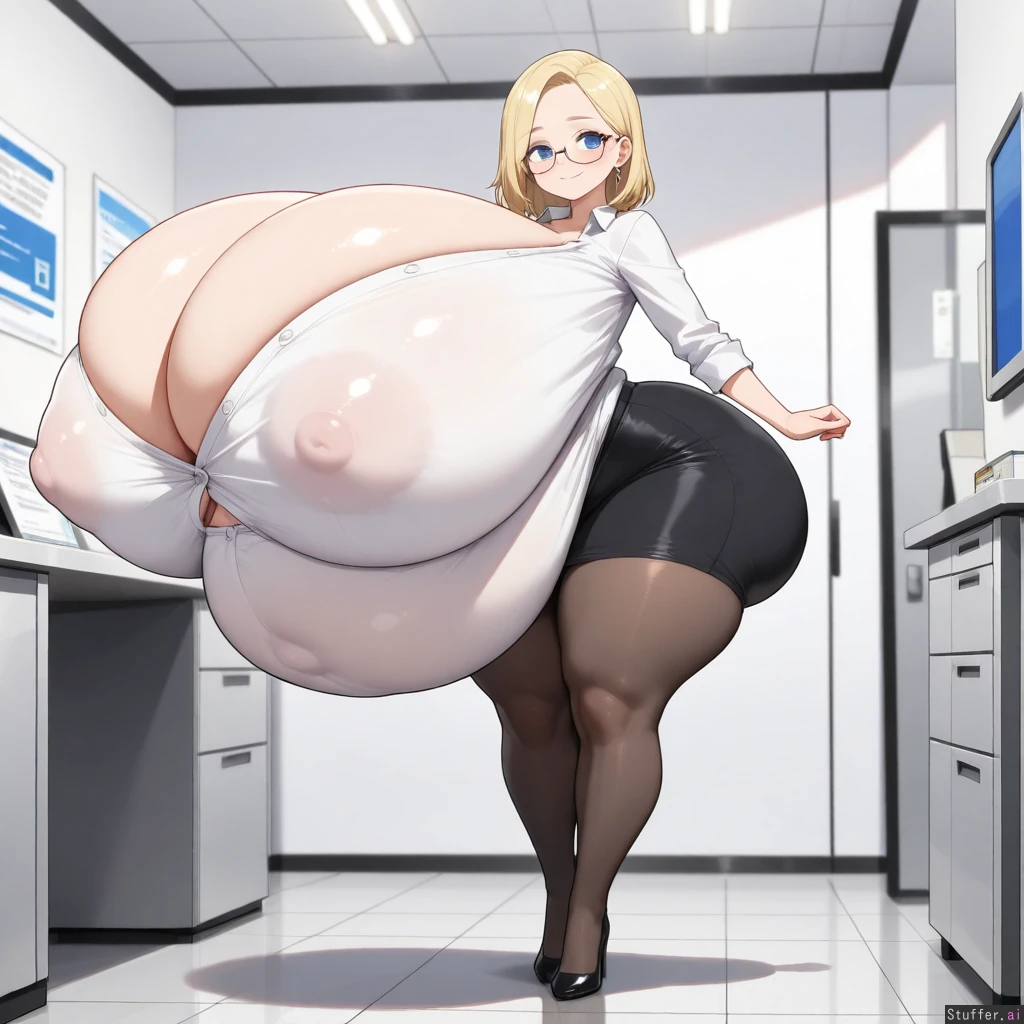 best quality), (high rating), absurd 4res, high res, detailed, ultra quality, ((high quality)), masterpiece, (ultra high resolution), anime style, stunning beauty, detailed face, intricate detail, not blurry, sophisticated detail, exquisite detail, absurd resolution, correct anatomy, 8k, (((highly detailed face)), highly detailed skin texture, detailed textures, definition lines, soft colors, full color, highly detailed face, beautiful face, glossy realistic skin, gorgeous, detailed face, detailed eyes, detailed mouth, ((zdemian,)) 1girl, solo, ((huge hyperpregnant belly)), ((, small height, petite,blue eyes, blonde medium hair, perfect anatomy, perfect colthes, perfect prosition, )), (((,huge body,thick thighs, fat legs, hyper huge round butt, wide hips, cleavage, ))), (((( gigantic breast ballooning, spherical breast, hyper_gigantic_breast,)))), ((( covered ass, covered breast, covered belly ))), ((torso breast, erect nipples, head sinking in her body, white buttoned shirt, black pencil skirt, pantyhose, office, small smile, Standing, heavy blush, earrings, glasses,)), close of the viewer, full body