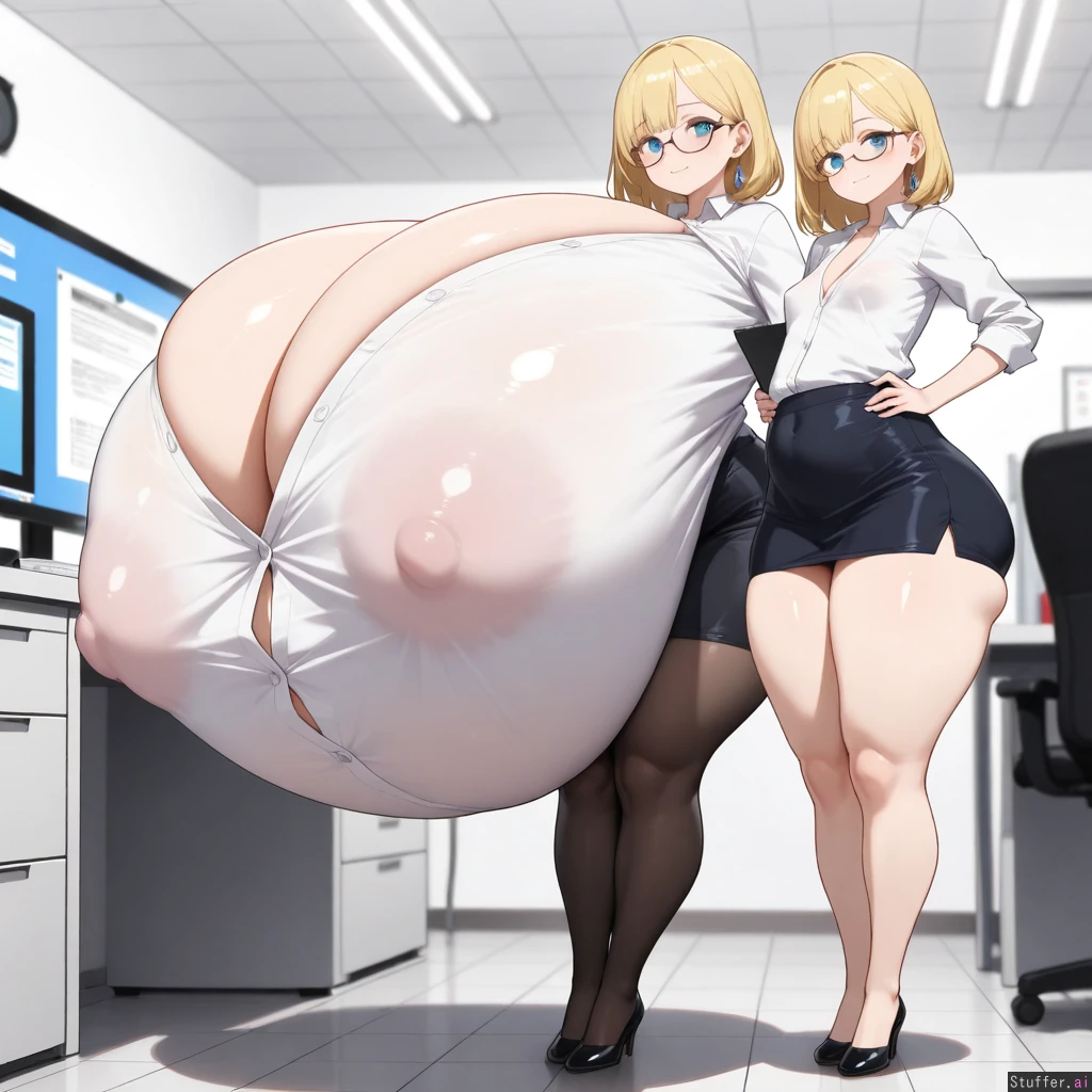 best quality), (high rating), absurd 4res, high res, detailed, ultra quality, ((high quality)), masterpiece, (ultra high resolution), anime style, stunning beauty, detailed face, intricate detail, not blurry, sophisticated detail, exquisite detail, absurd resolution, correct anatomy, 8k, (((highly detailed face)), highly detailed skin texture, detailed textures, definition lines, soft colors, full color, highly detailed face, beautiful face, glossy realistic skin, gorgeous, detailed face, detailed eyes, detailed mouth, ((zdemian,)) 1girl, solo, ((huge hyperpregnant belly)), ((, small height, petite,blue eyes, blonde medium hair, perfect anatomy, perfect colthes, perfect prosition, )), (((,huge body,thick thighs, fat legs, hyper huge round butt, wide hips, cleavage, ))), (((( gigantic breast ballooning, spherical breast, hyper_gigantic_breast,)))), ((( covered ass, covered breast, covered belly ))), ((torso breast, erect nipples, head sinking in her body, white buttoned shirt, black pencil skirt, pantyhose, office, small smile, Standing, heavy blush, earrings, glasses,)), close of the viewer, full body