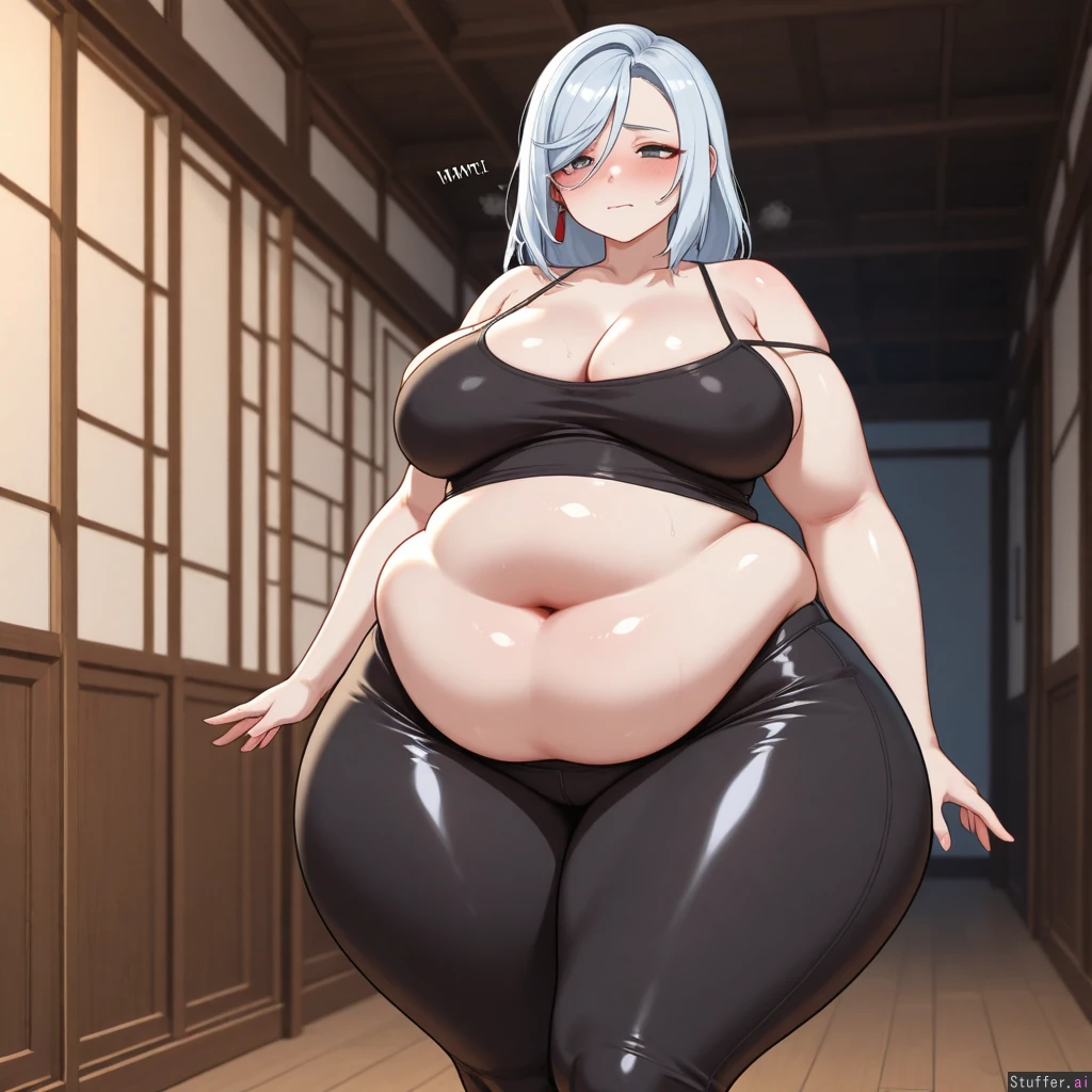 (best quality), (high rating), absurd res, high res, detailed, ultra quality, ((high quality)), masterpiece, (ultra high resolution), anime style, stunning beauty, detailed face, intricate detail, sophisticated detail, exquisite detail, absurd resolution, correct anatomy, 8k, (highly detailed face), highly detailed skin texture, 1girl, pale skin,(shenhe genshin impact), ((bedroom, dark lighting)), embarrassed, ((((huge_hips:1.9)))), ((((massive hips)))), ((ultra_wide_hips)), ((hyper thick hips)), ((fat belly)), (embarrassed, camisole off one shoulder, black leggings), thick waist, wide hips, (huge thighs), bottomheavy, (thick thighs), chubby_belly, fat rolls, (big_belly:1.3), ((belly noises)), ((too full to move)), ((panting)), (((embarrassed))), ((belly gurgling)), ((heavy blush)), ((large breasts)), sloshing belly, squinting, upset, looking ahead, ((walking, leaning back, hands on back))), belly ache, burping, ((sagging breasts)),(((soft flabby fat arms:1.4))),((bursting breasts)),