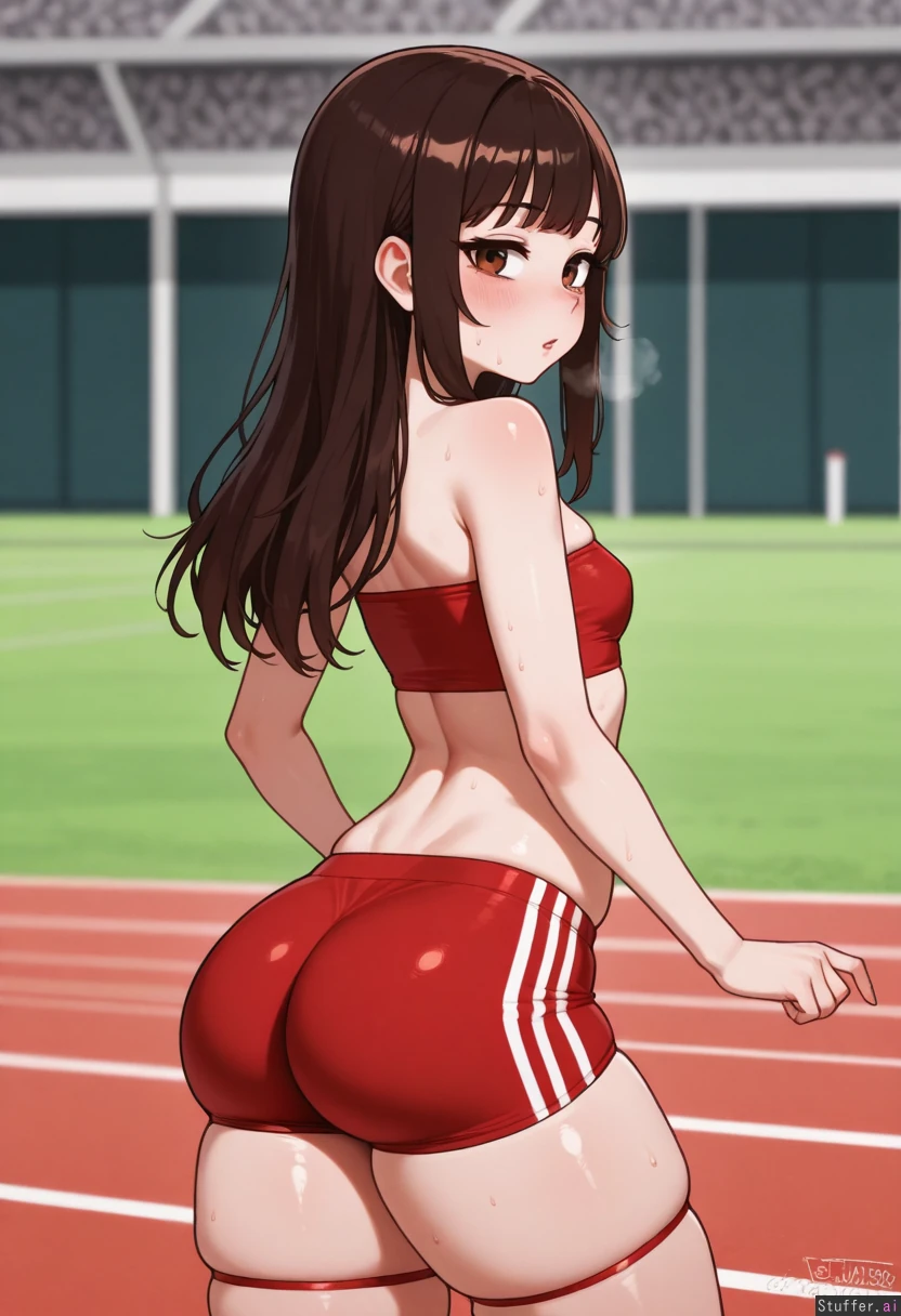 c.cu, betterwithsalt, ourobot, spellsx(artist), 1girl, straight brown hair, cute face, small breasts, slim, small belly, love handles, midriff, tight strapless top, running shorts, track and field, outgrown clothes, ((skindentation)), sweating, out of breath, bubble butt