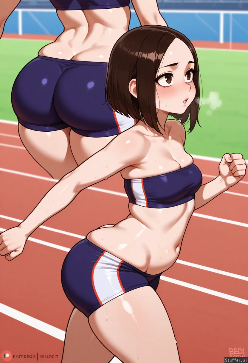 c.cu, betterwithsalt, ourobot, spellsx(artist), krekkov, 1girl, straight brown hair, cute face, small breasts, slim, small belly, love handles, midriff, tight strapless top, running shorts, track and field, outgrown clothes, ((skindentation)), sweating, out of breath, bubble butt, massive ass, bottomheavy, plump thighs, huge ass, (butt_crack, butt_cleavage),