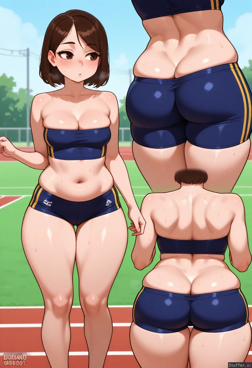 c.cu, betterwithsalt, ourobot, spellsx(artist), krekkov, 1girl, straight brown hair, cute face, small breasts, slim, small waist, love handles, midriff, tight strapless top, running shorts, track and field, outgrown clothes, ((skindentation)), sweating, out of breath, bubble butt, massive ass, bottomheavy, plump thighs, huge ass, (butt_crack, butt_cleavage),